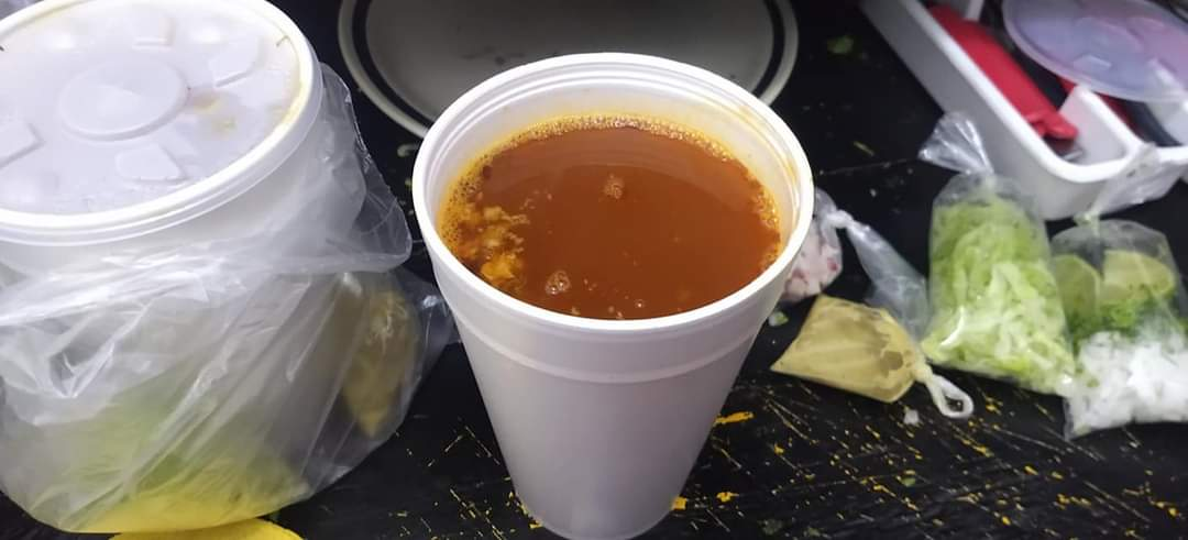 1/2 L de consomé con 75 g de carne (cebolla, cilantro, limones y 3 tortillas).