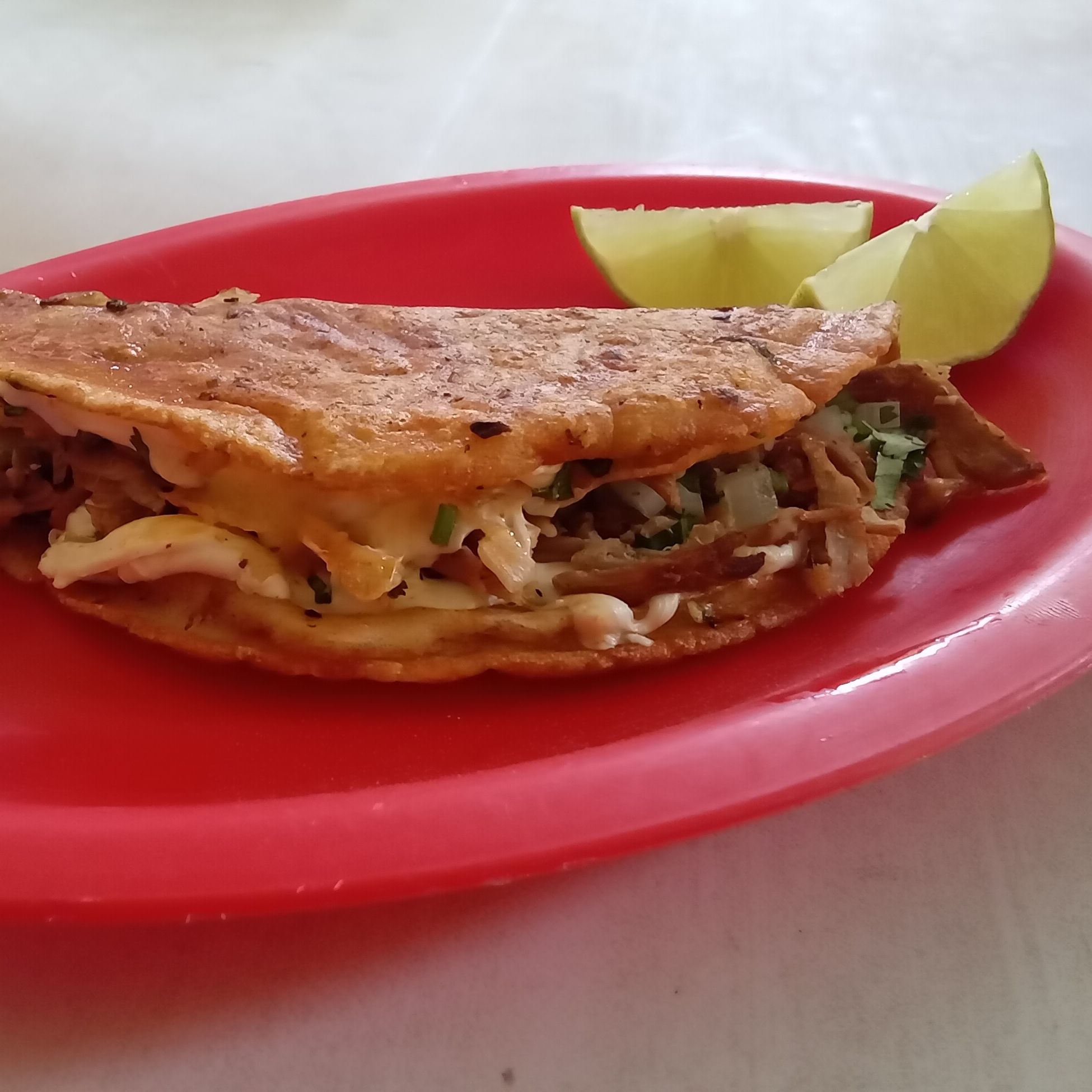1pz-Dos tortillas grandes rellenas de carne, queso oaxaca bien derretido, cebolla y cilantro