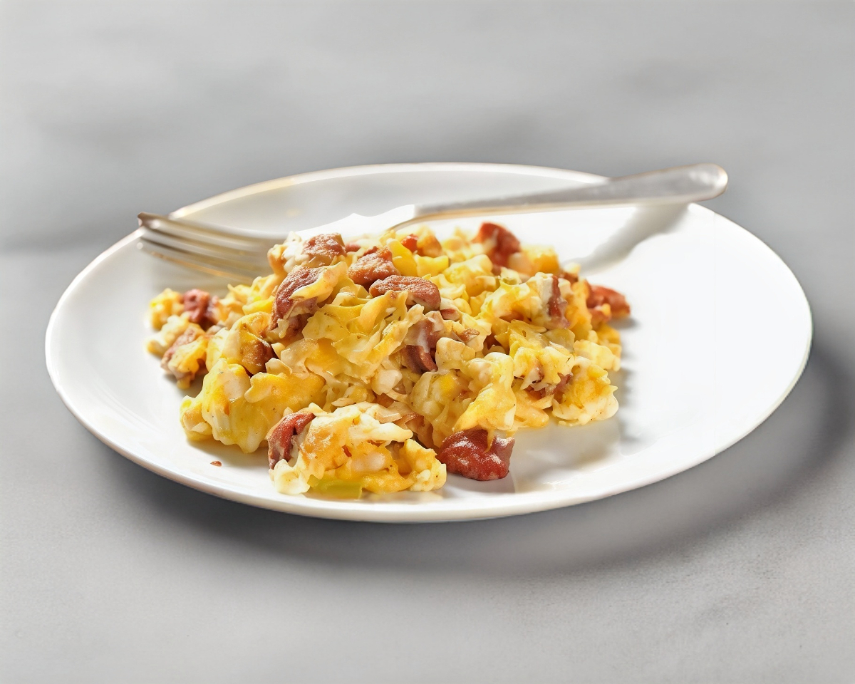 Huevos con Chorizo. Incluye 2 guarniciones del dia. Salsas a eleccion