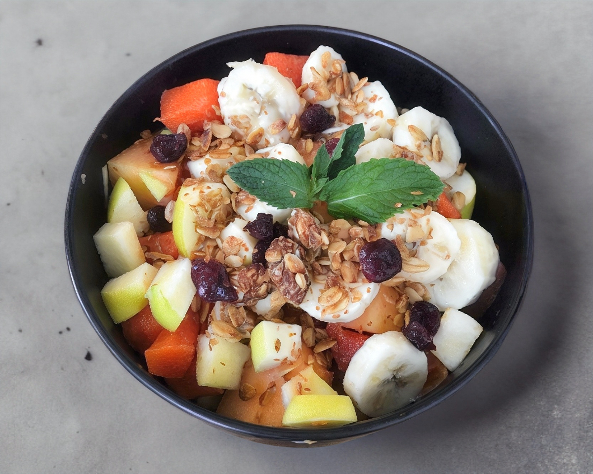 Frutas de temporada en envase de 1/2 litro con Granola y Miel. Siempre fresca. (Las frutas pueden variar).
