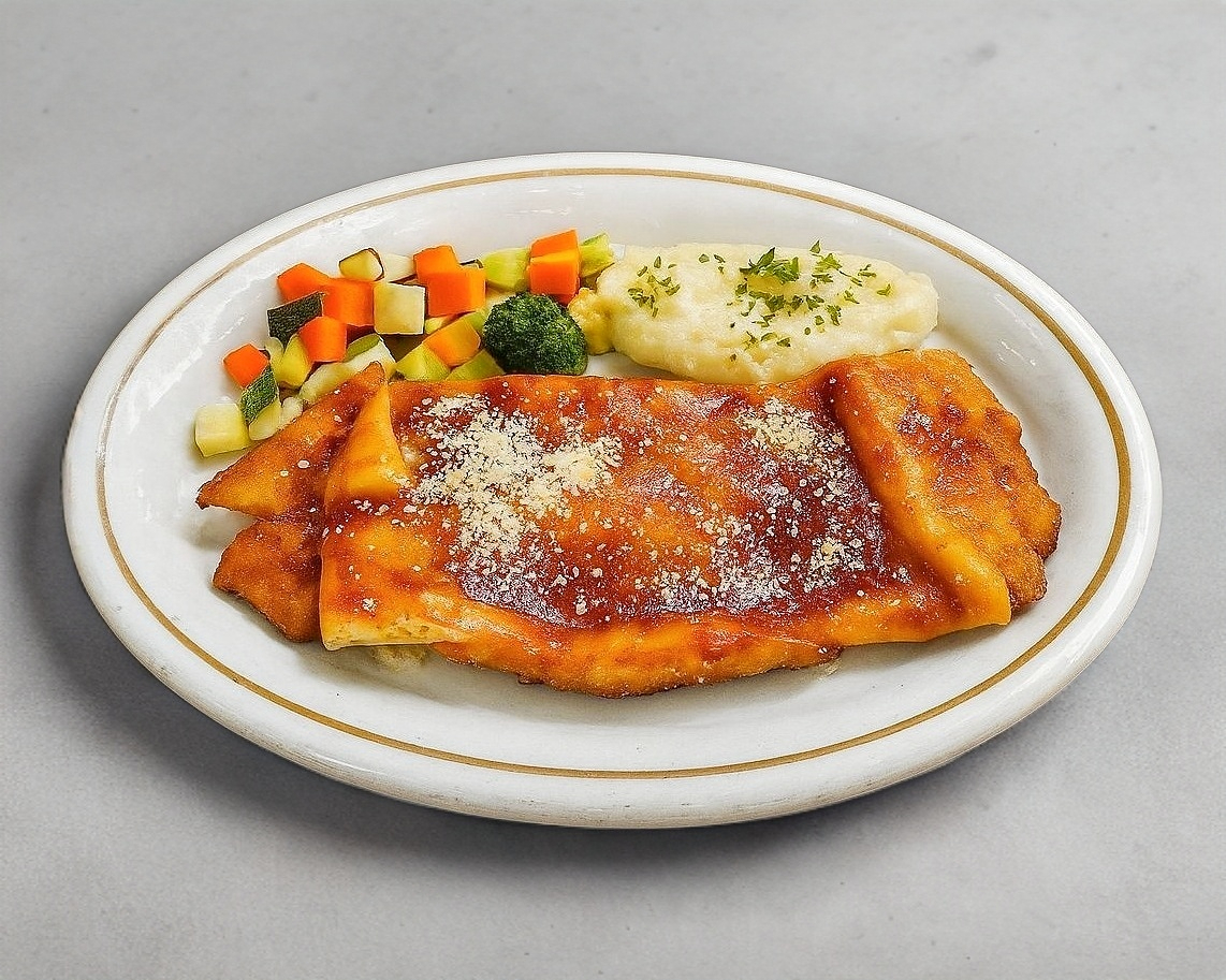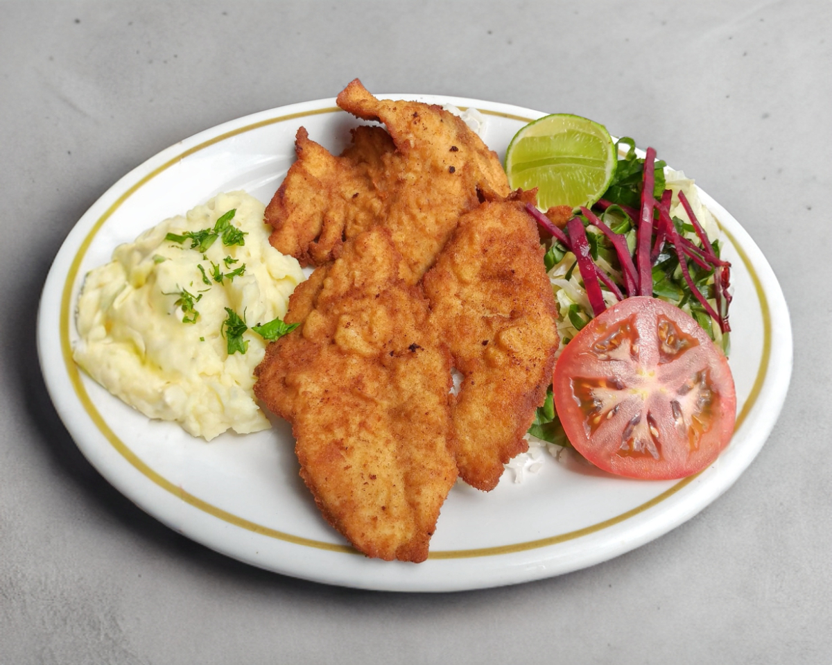 Crujiente y deliciosa pechuga empanizada, bañada en salsa cassé, gratinada con queso manchego y parmesano. Incluye 2 guarniciones