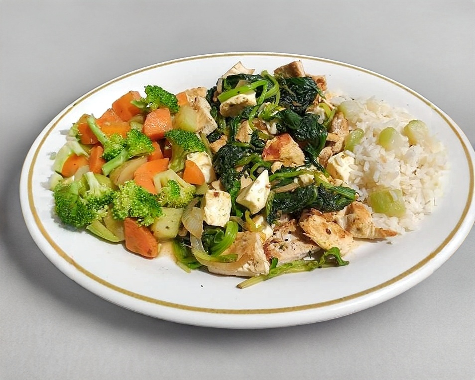 Trocitos de pechuga salteada con hojas de espinacas y queso panela Incluye 2 guarniciones