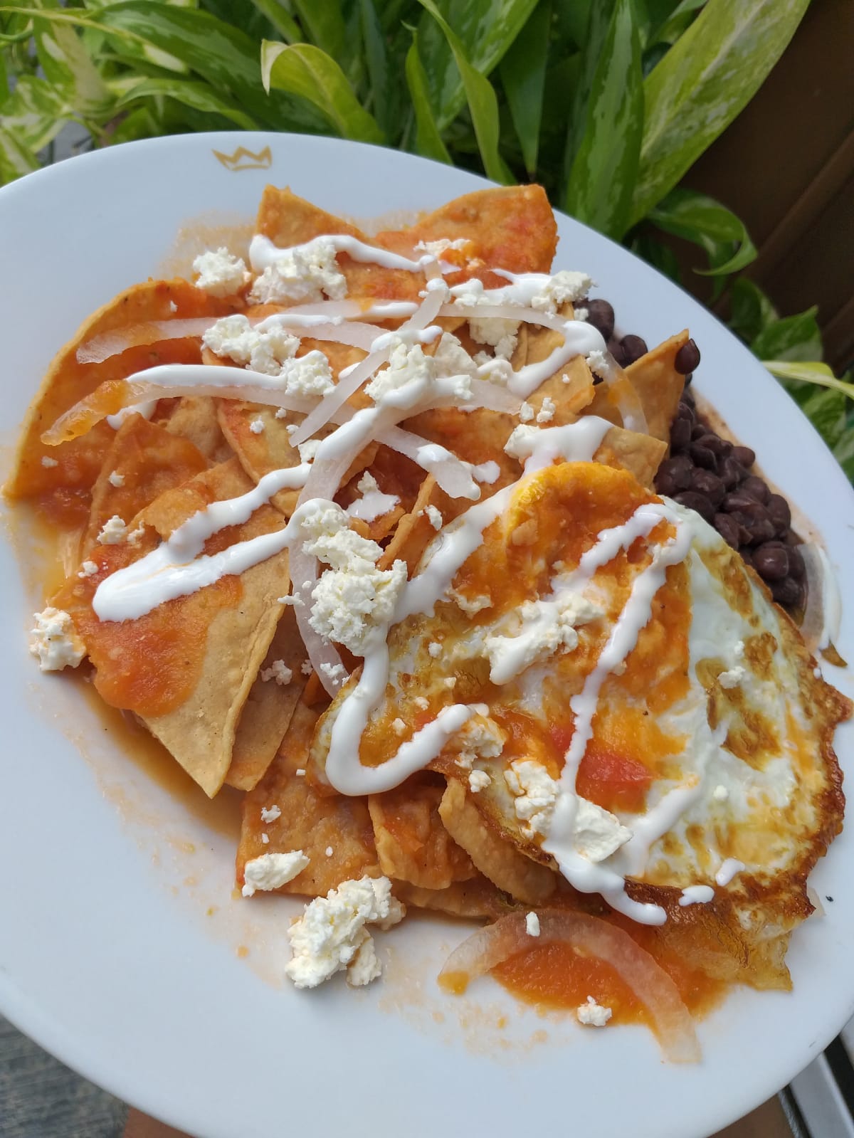 Totopos caseros, bañados en salsa roja o verde picosa 100% natural. Acompañado de huevo, queso cotija, crema y cebolla