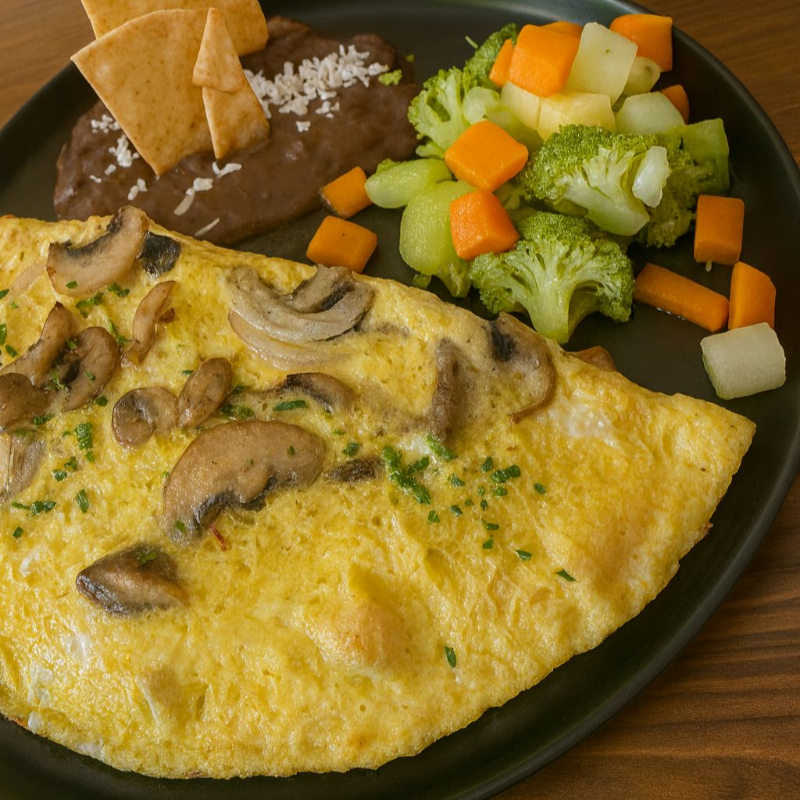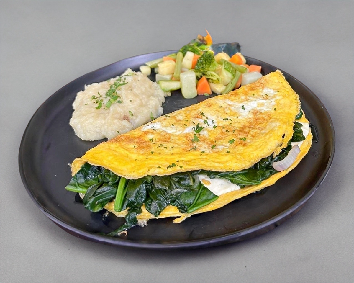 Omelette relleno de espinacas y queso panela Incluye 2 guarniciones