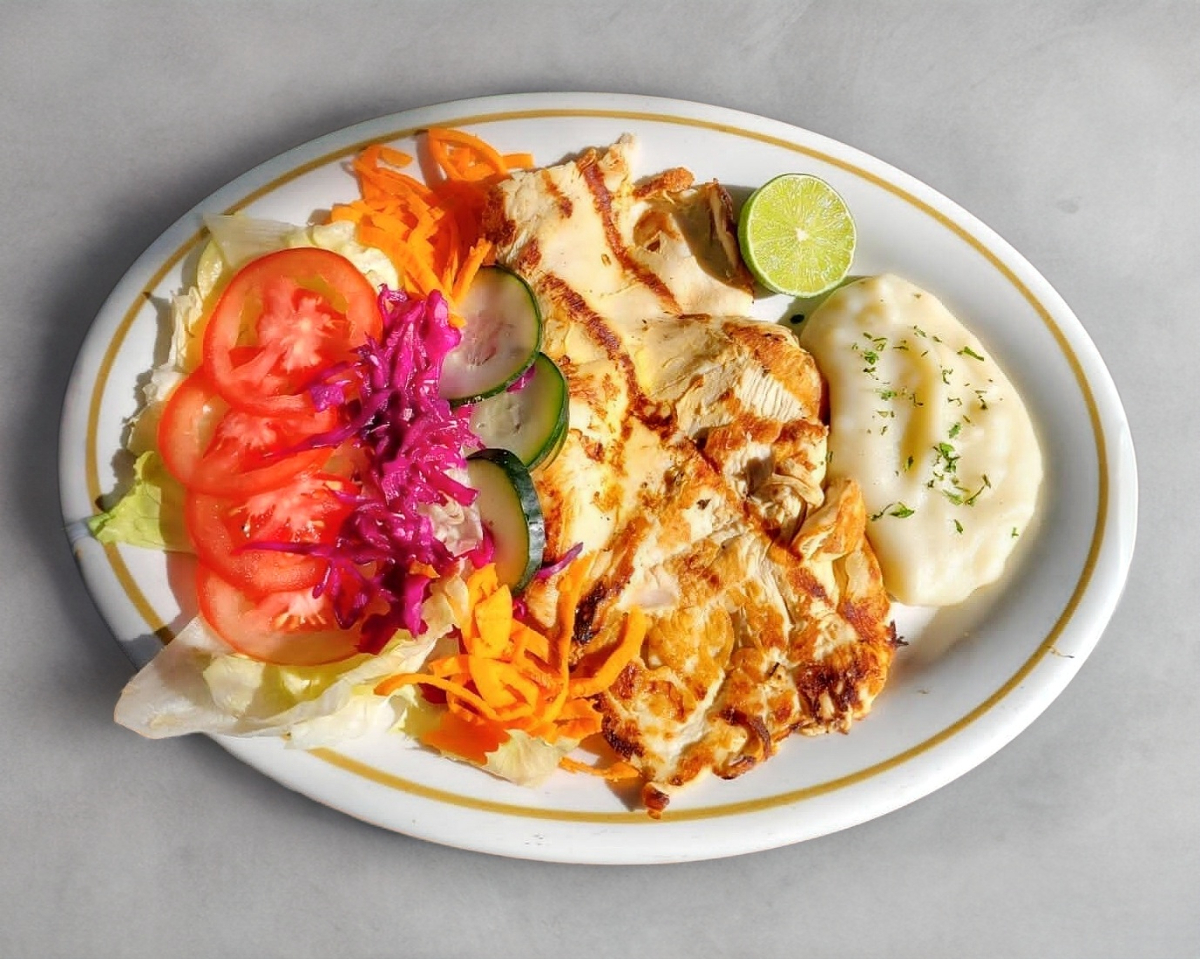 Pechuga asada fresca (180 g peso en crudo), sobre una cama de arroz acompañada de 2 guarniciones a elección. (Porción personal)