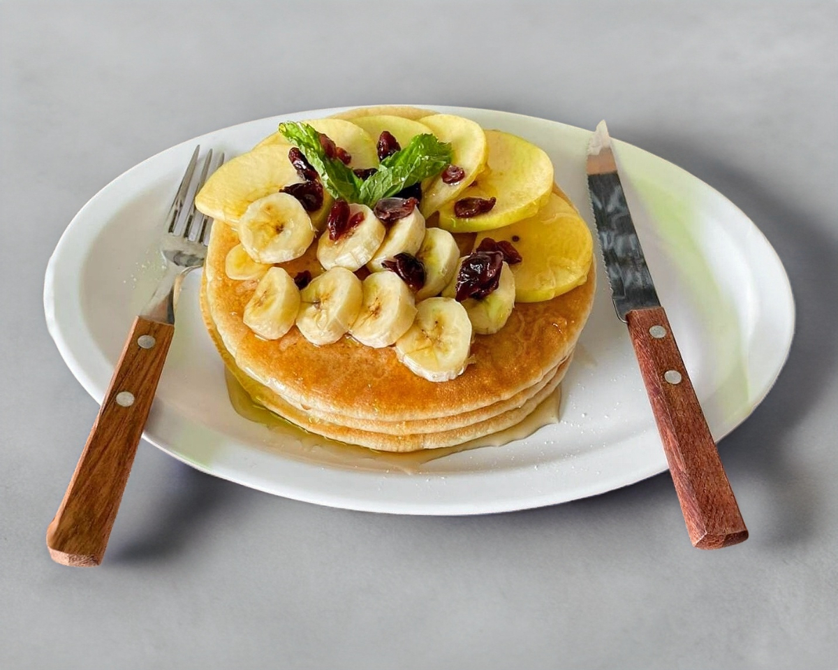 Hot Cakes con Fruta de Temporada, acompañado de Miel o Lechera a elegir