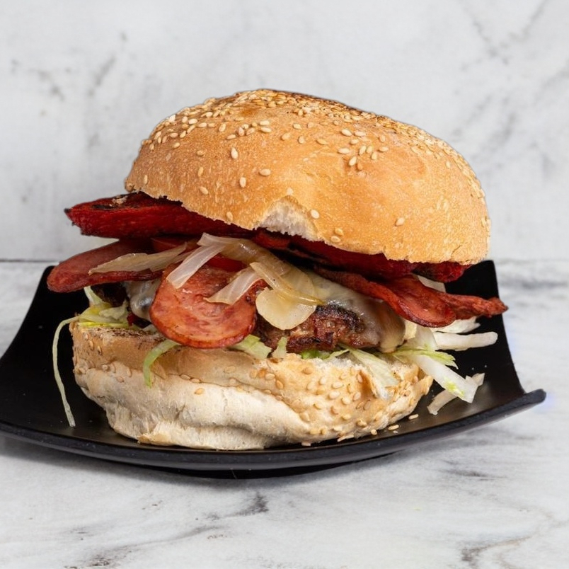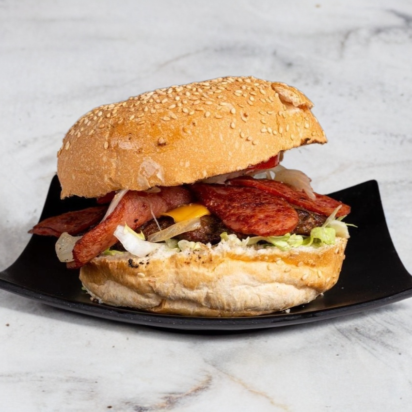 Pan y carne de res de tamaño grande, queso amarillo, tocino y piña.