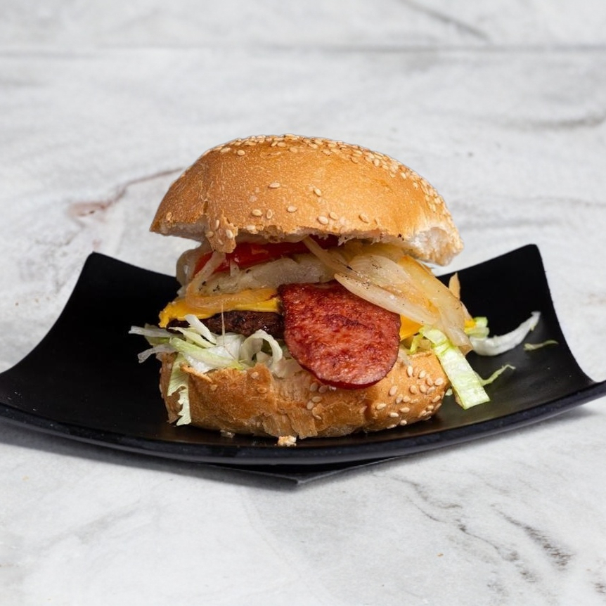 Pan y carne de res de tamaño grande, queso manchego y champiñones.