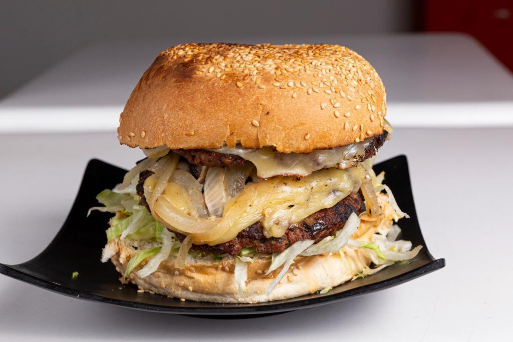 Pan tamaño tradicional, doble carne de res y queso amarillo.