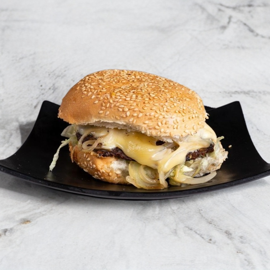 Pan tamaño tradicional, carne de res y queso amarillo.