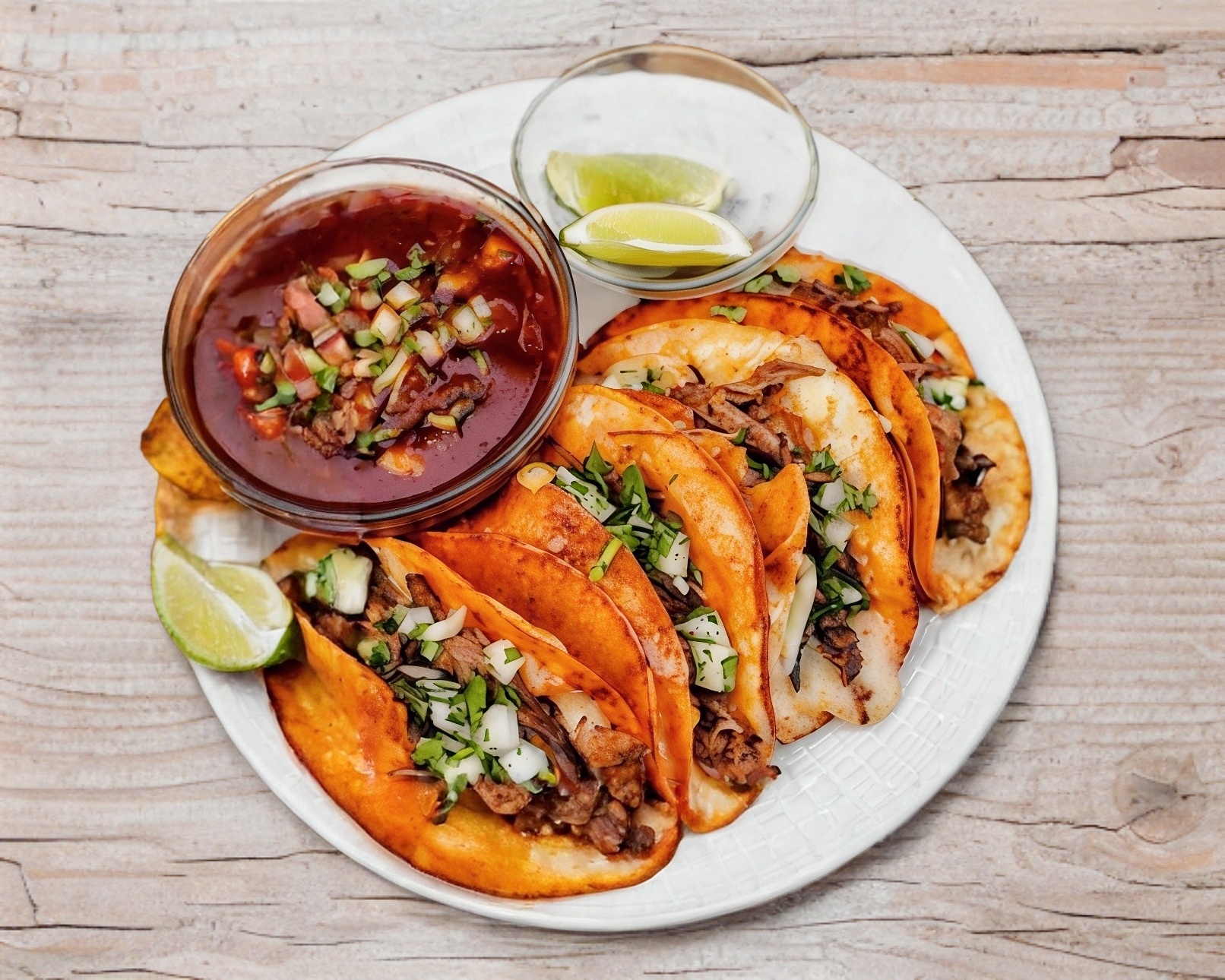 3 ricos tacos +1 consomé chico cebolla cilantro limón y salsa