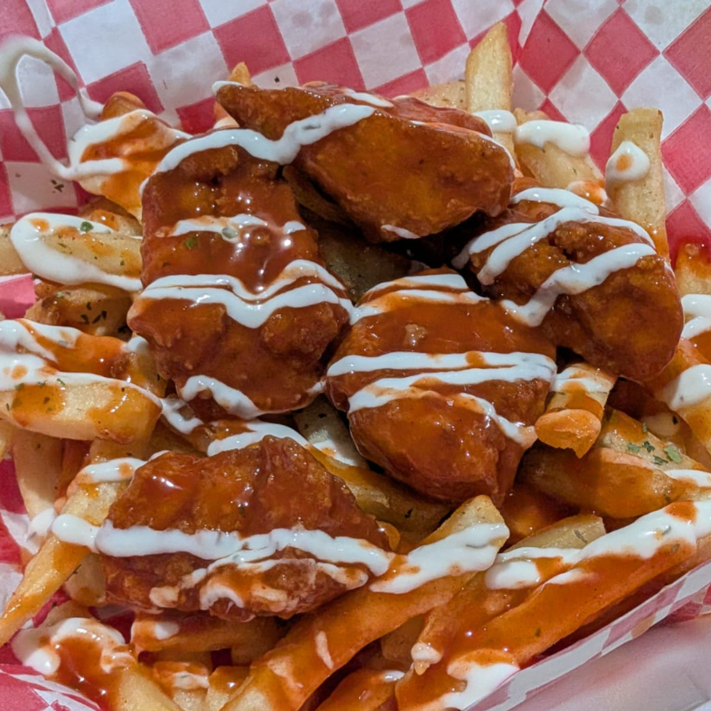 Pollo en Boneless (200g), Papas (400g) bañados en buffalo con ranch. Atáscate y botanea con esta delicia.