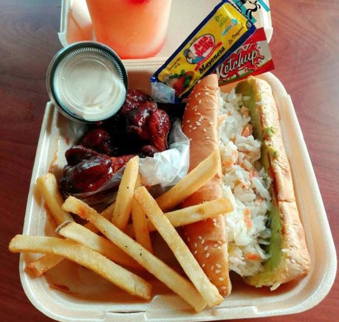 Hamburguesa sencilla,papas frita,3 alitas sabor,ranch, jalapeños, catsup