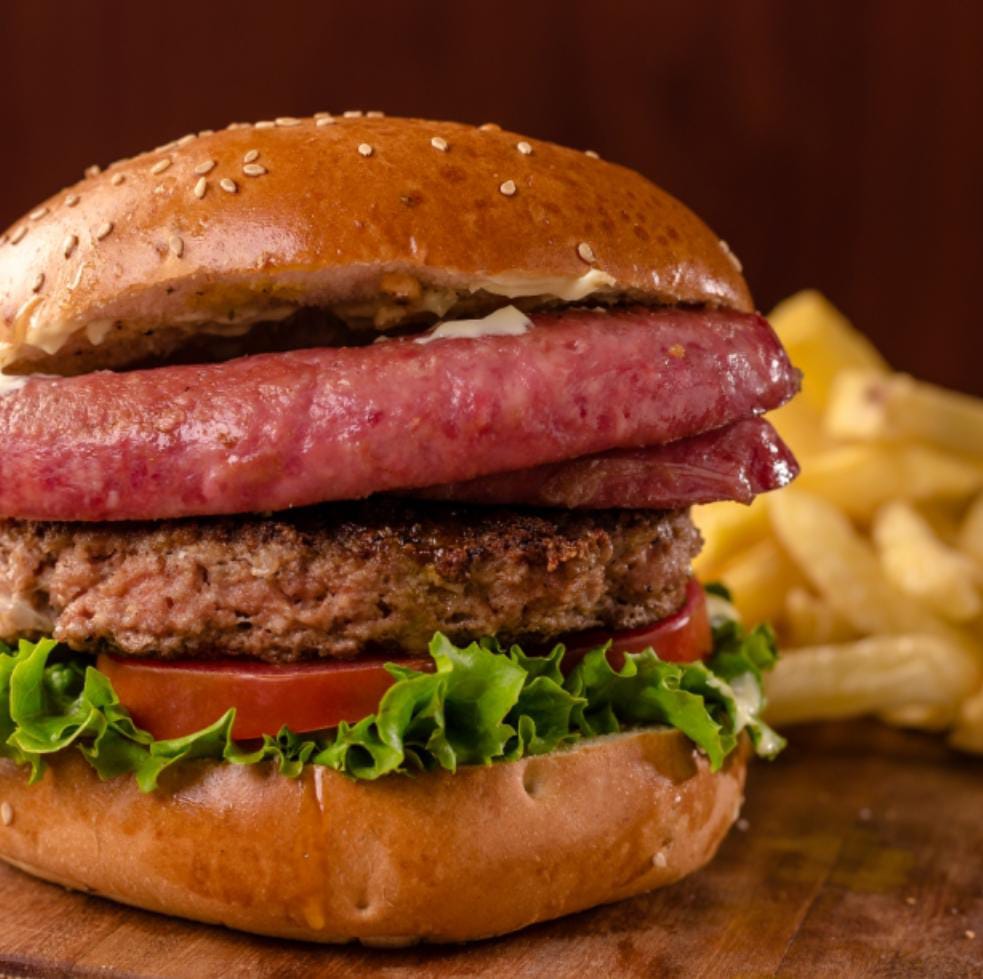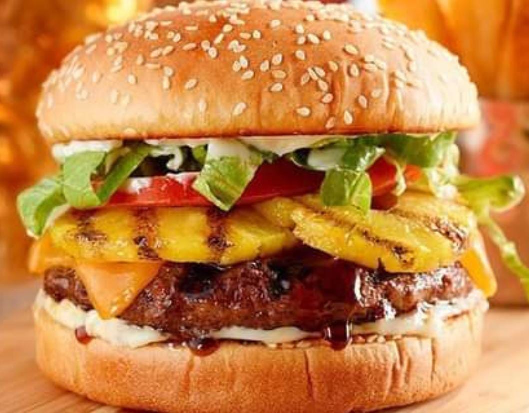 Pan artesanal,carne,jamón,queso,tocino,verduras,mayonesa,catsup,piña asada con un toque de canela.
