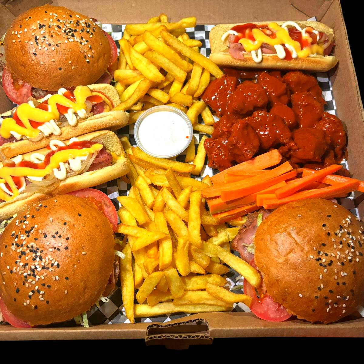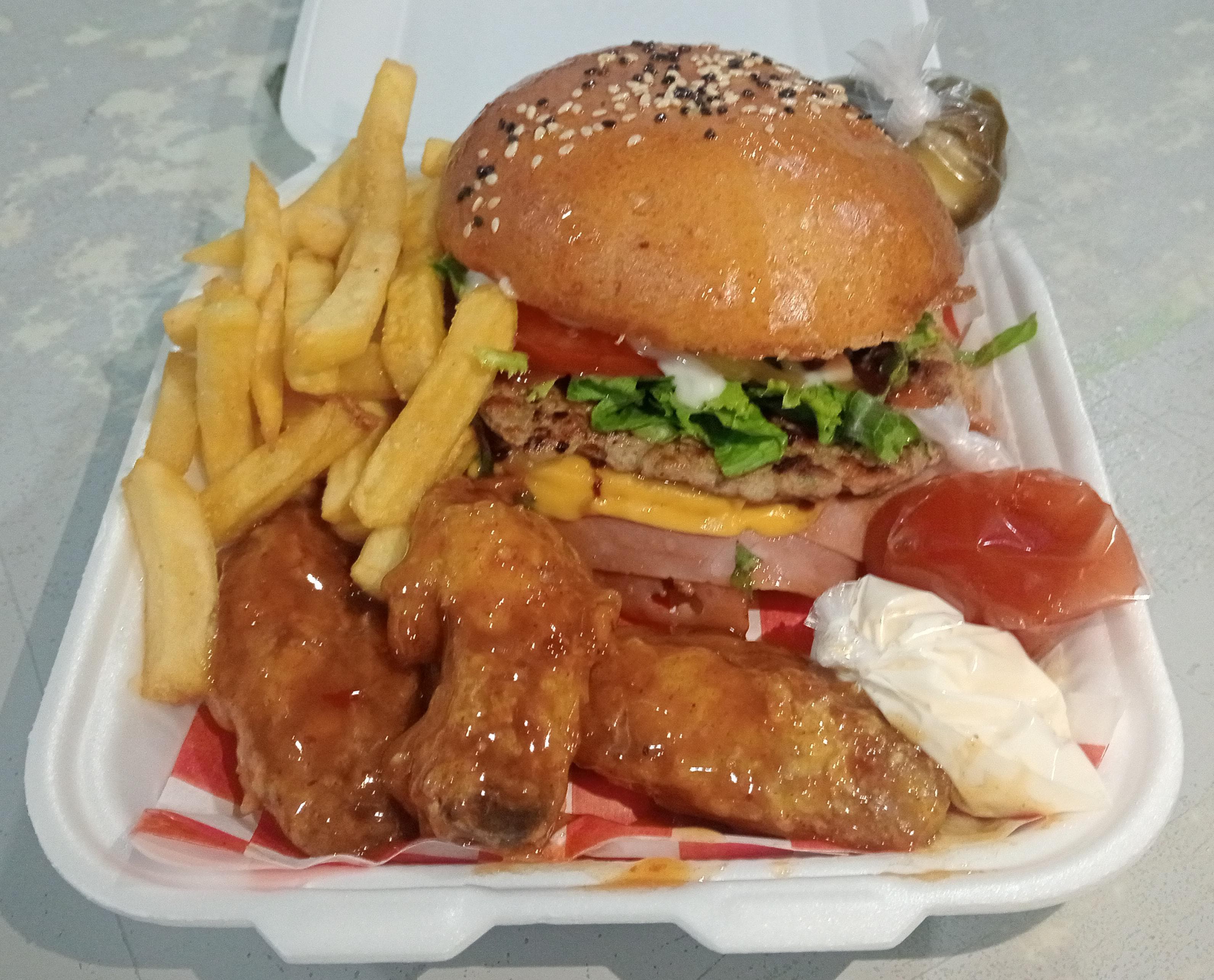 Hamburguesa clásica,papas fritas,boneless Buffalo.