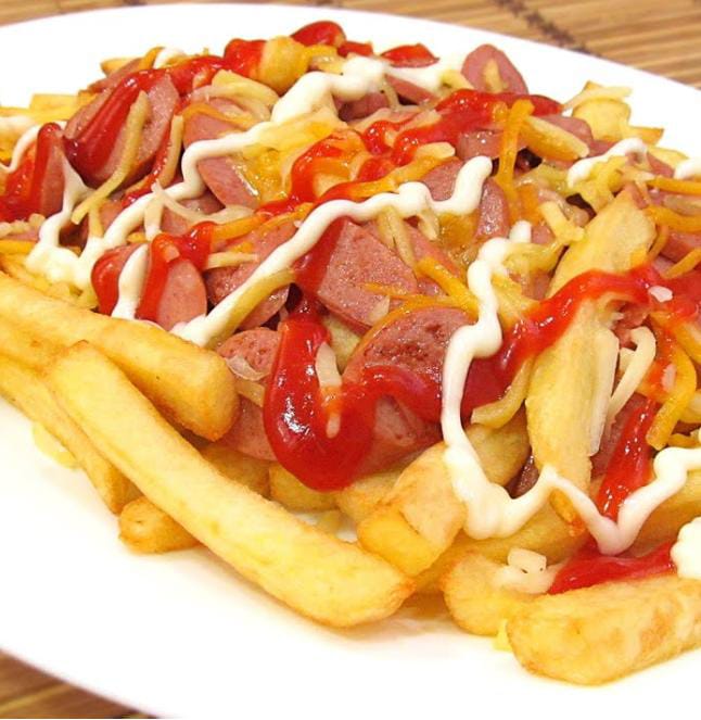 Papas fritas,salchicha frita,catsup servido en un contenedor 7x7
