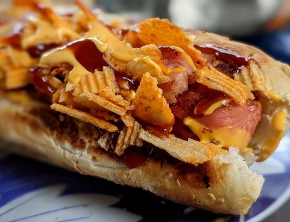 Salchicha,jamón,queso,cebolla y piña asada con un toque de canela.