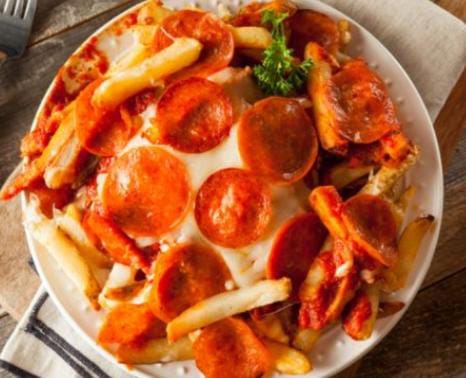Papas fritas con queso cheddar y peperonie, servido en un contenedor 7x7