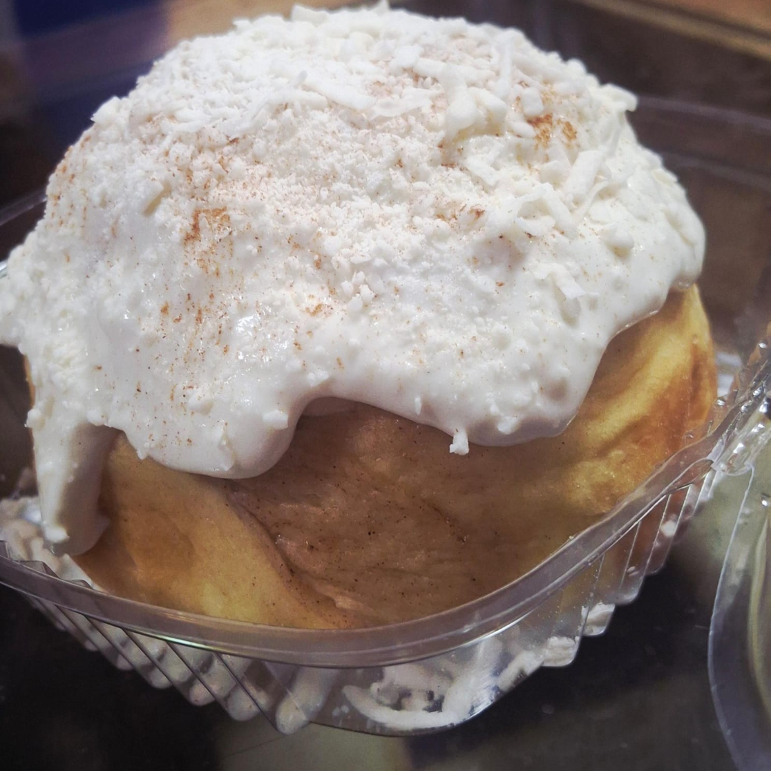 Rol de canela con Crema de coco coco rayado y un delicioso toque de canela.