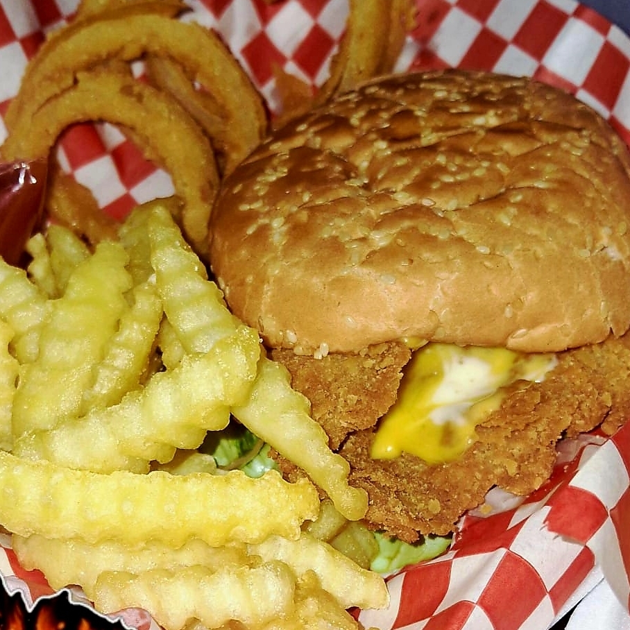Combinación entre carne de res con pechuga de pollo empanizado, quéso, cebolla carmelizada, tómate lechuga y mayonesa todos incluyen papas y aros de cebolla