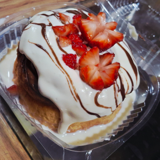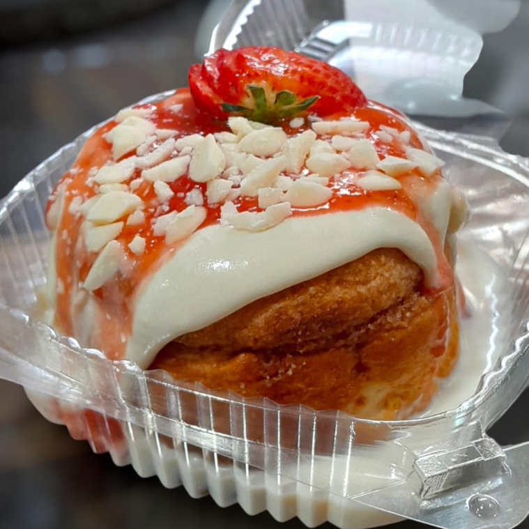 Delicioso rol de canela cubierto con crema de la casa, Nutella, y fresa natural.