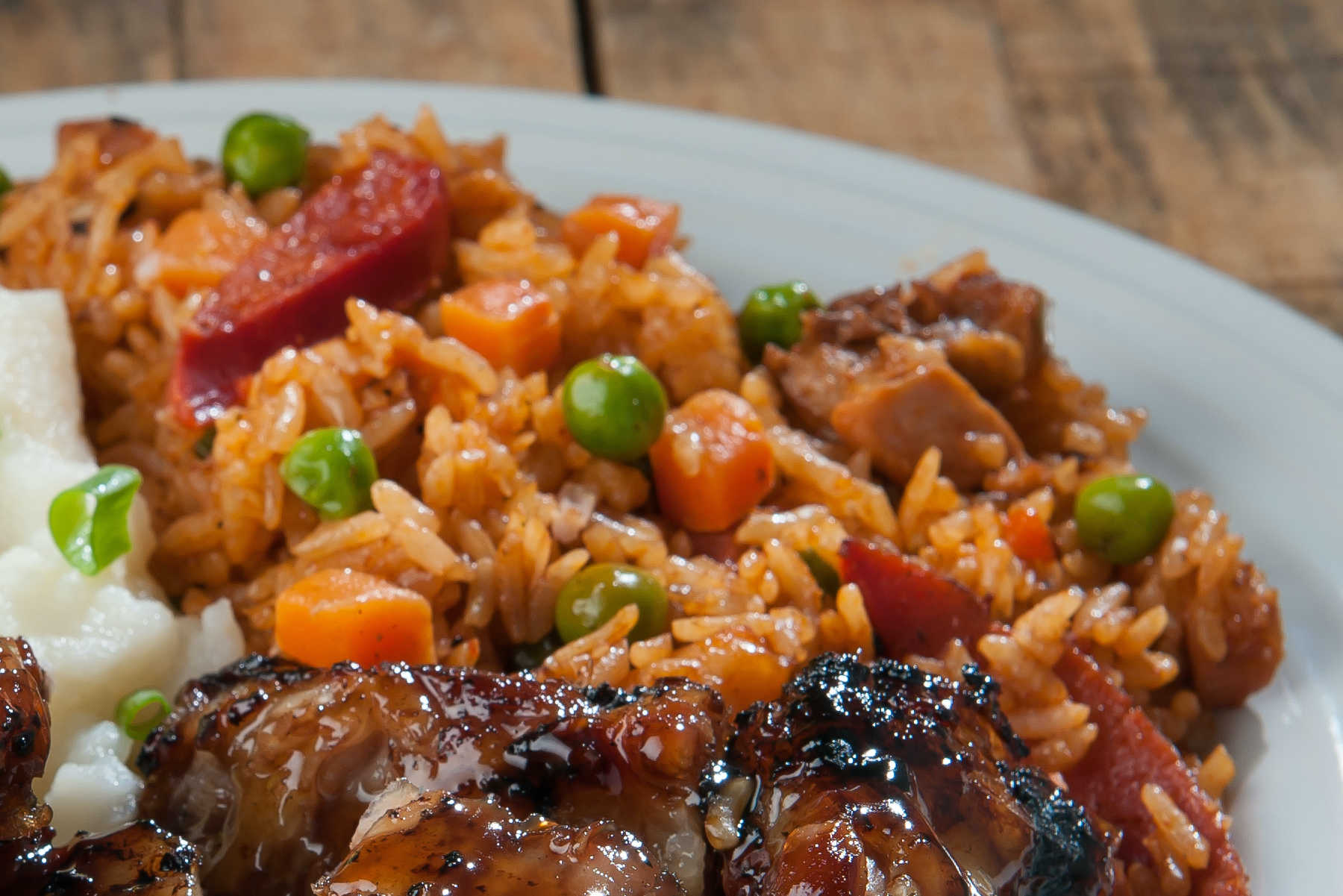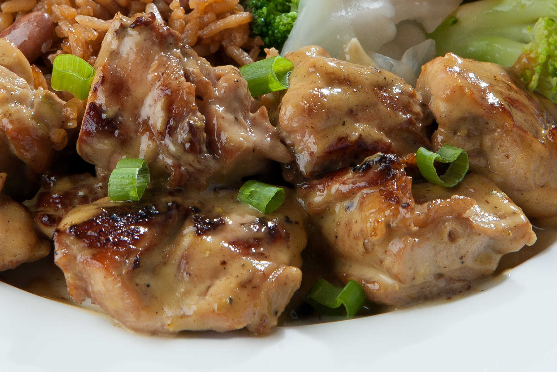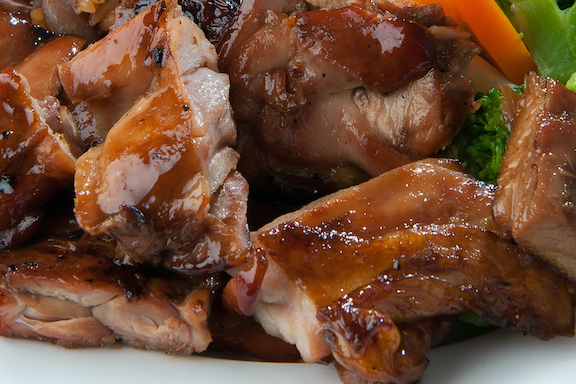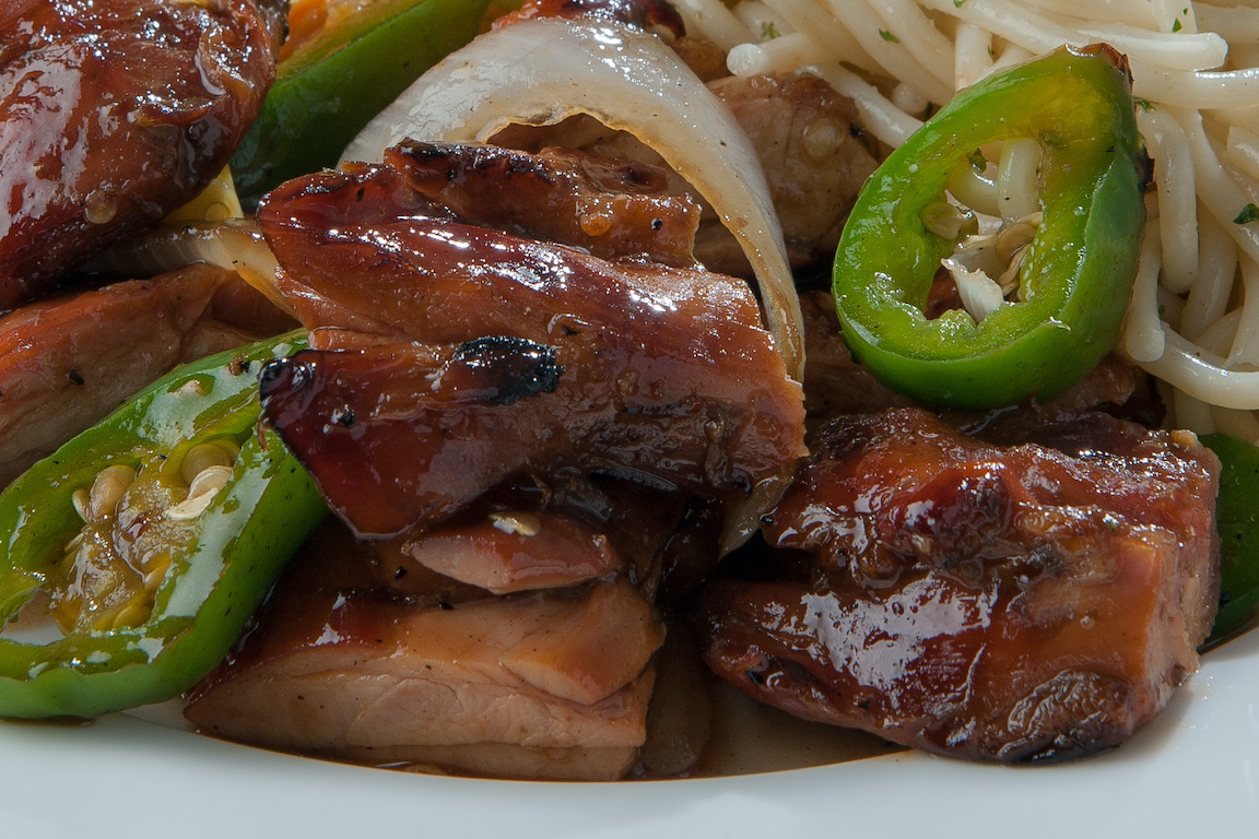 Deliciosos Trozos De Pierna-Muslo De Pollo Asados Con Cebolla Y Jalapeño, Y Bañados En Una Salsa Dulce Con Acento Asiático.