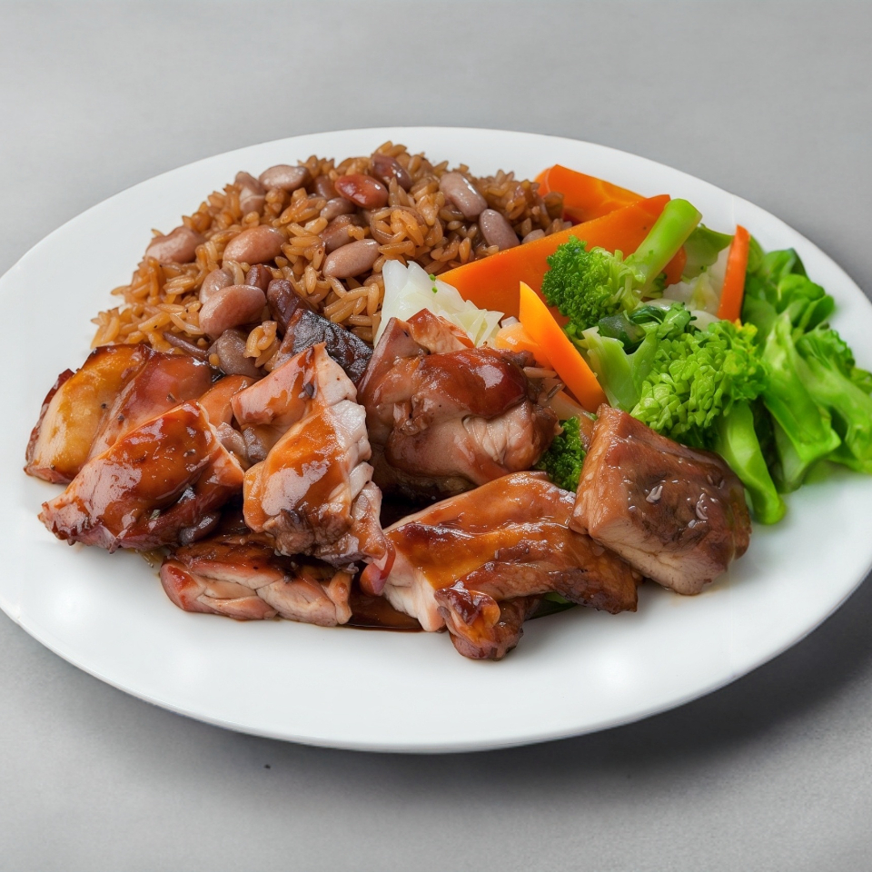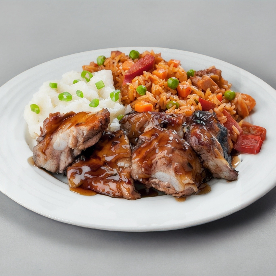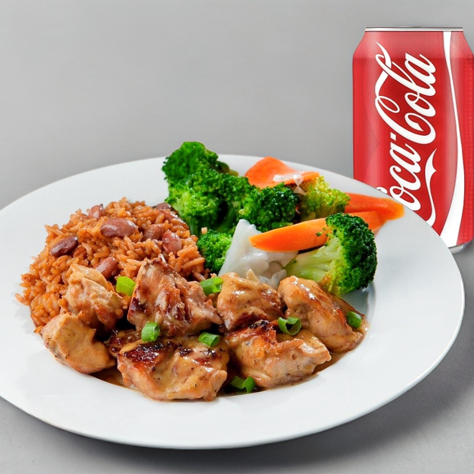 Deliciosos Trozos De Pierna-Muslo De Pollo Asados Con Cebolla Y Jalapeño, Y Bañados En Una Salsa Dulce Con Acento Asiático, Con Dos Guarniciones Y 3 Refrescos En Lata De 350ml.