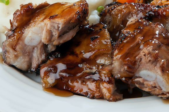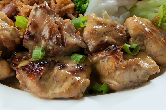 Tiernos Trozos De Pierna-Muslo De Pollo A La Parrilla Con Nuestra Famosa Salsa Bourbon.