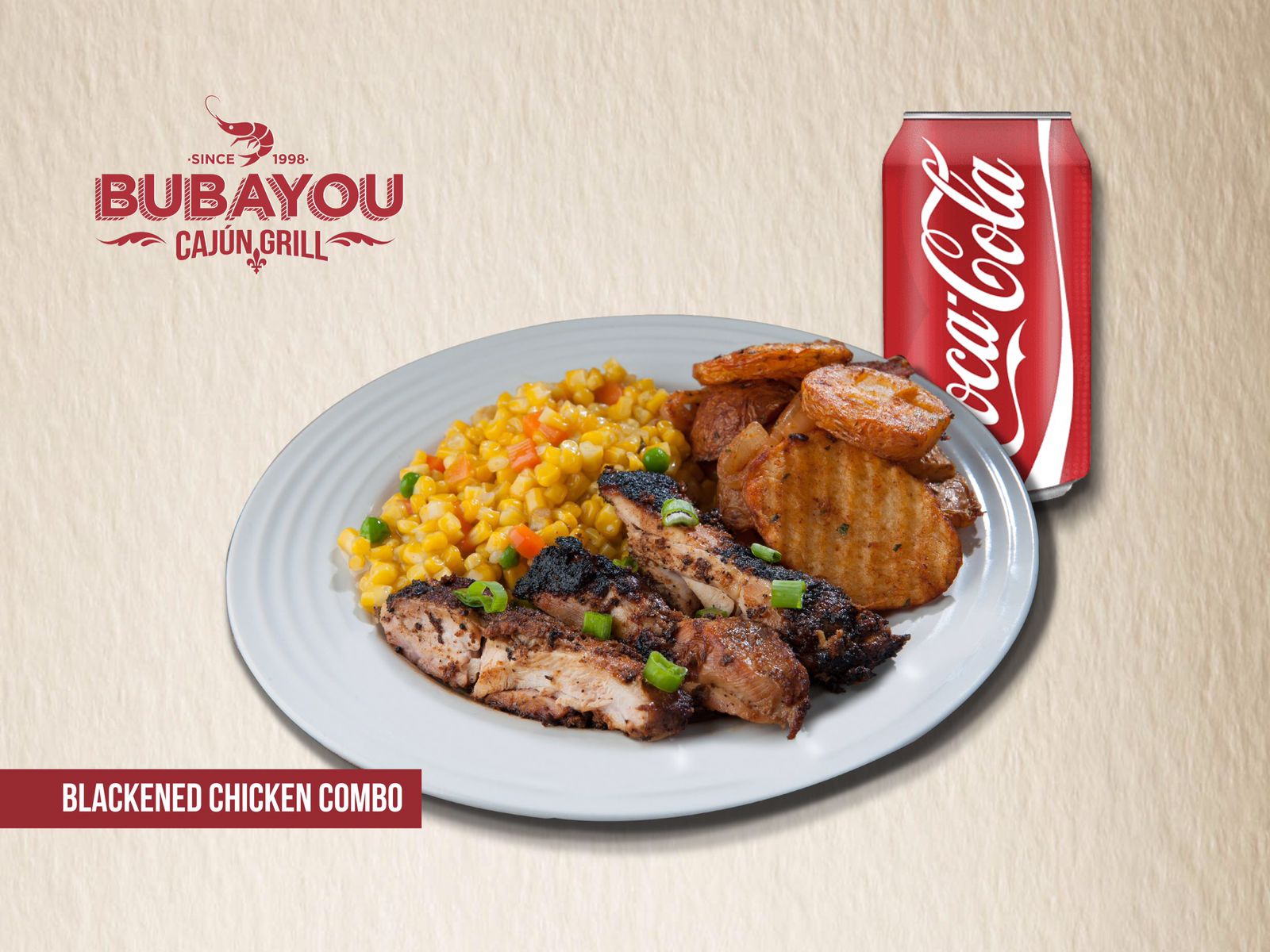 Cubierto Con Especias Secretas De Bubayou, Y Ennegrecido A La Plancha. Un Auténtico Clásico, Con Dos Guarniciones Y 3 Refrescos En Lata De 350ml.