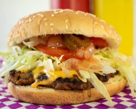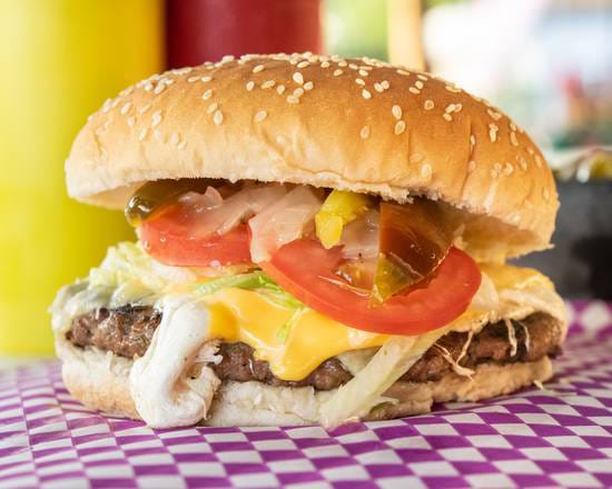 120 gr de carne casera al carbón con queso amarillo preparada con lechuga, jitomate, cebolla caramelizada, cátsup, mostaza y mayonesa.