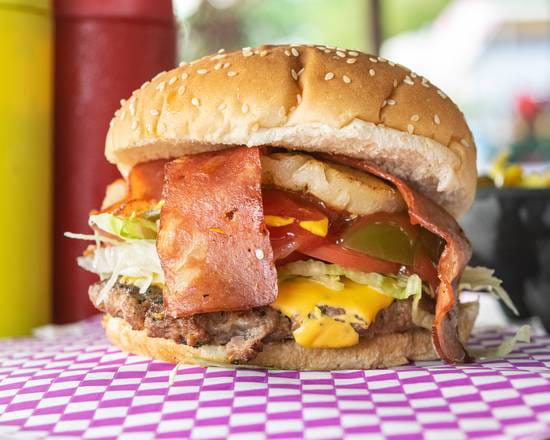 120 gr de carne casera asada al carbón con queso amarillo, piña y tocino, preparada con lechuga, jitmate, cebolla caramelizada, cátsup, mostaza y mayonesa.
