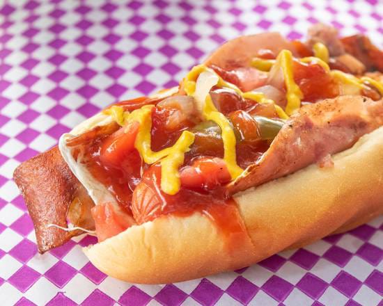Salchicha de pavo con tocino y piña, servido con jitomate, cebolla, cátsup, mostaza y mayones.