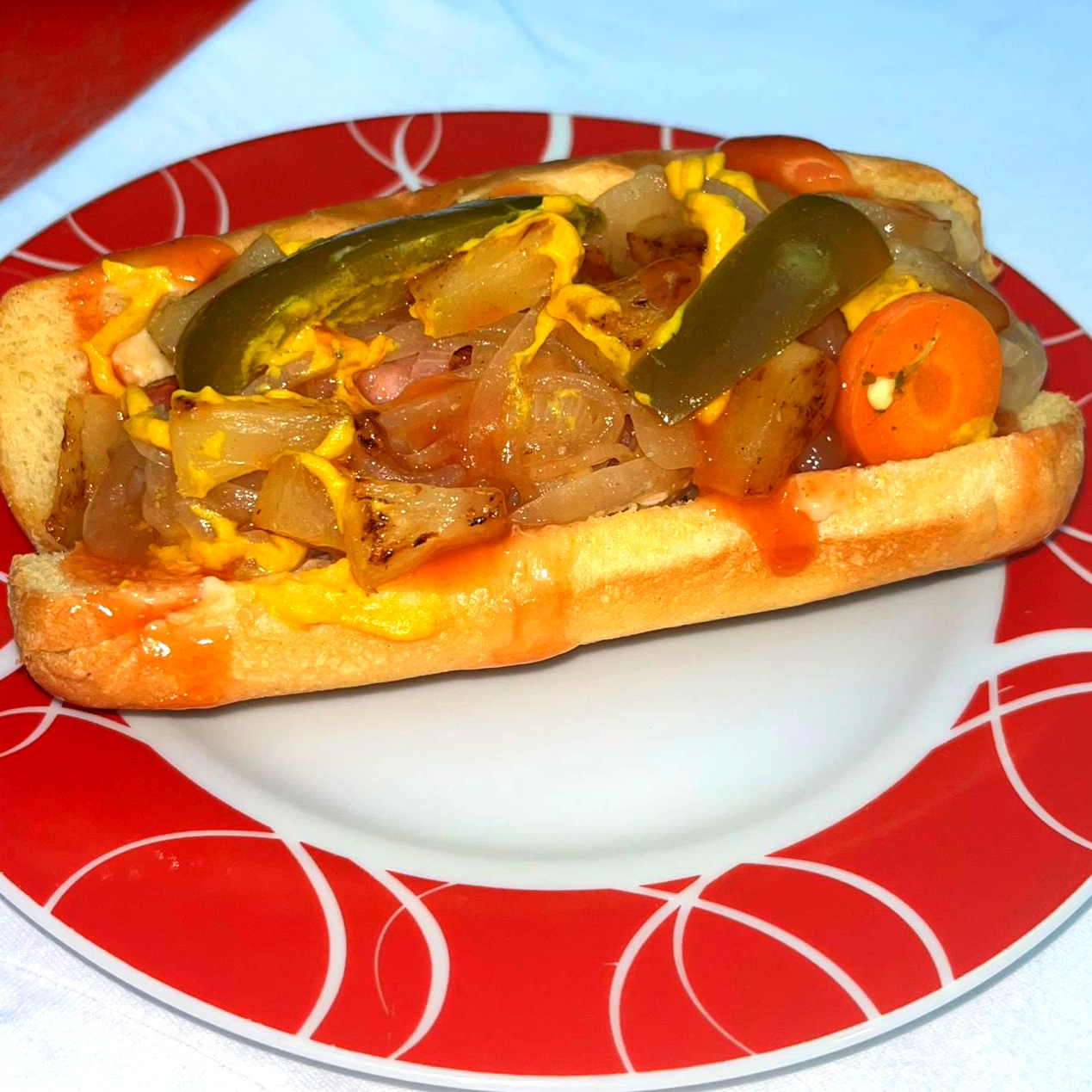Salchicha,cebolla, mayonesa, jalapeño, catsup