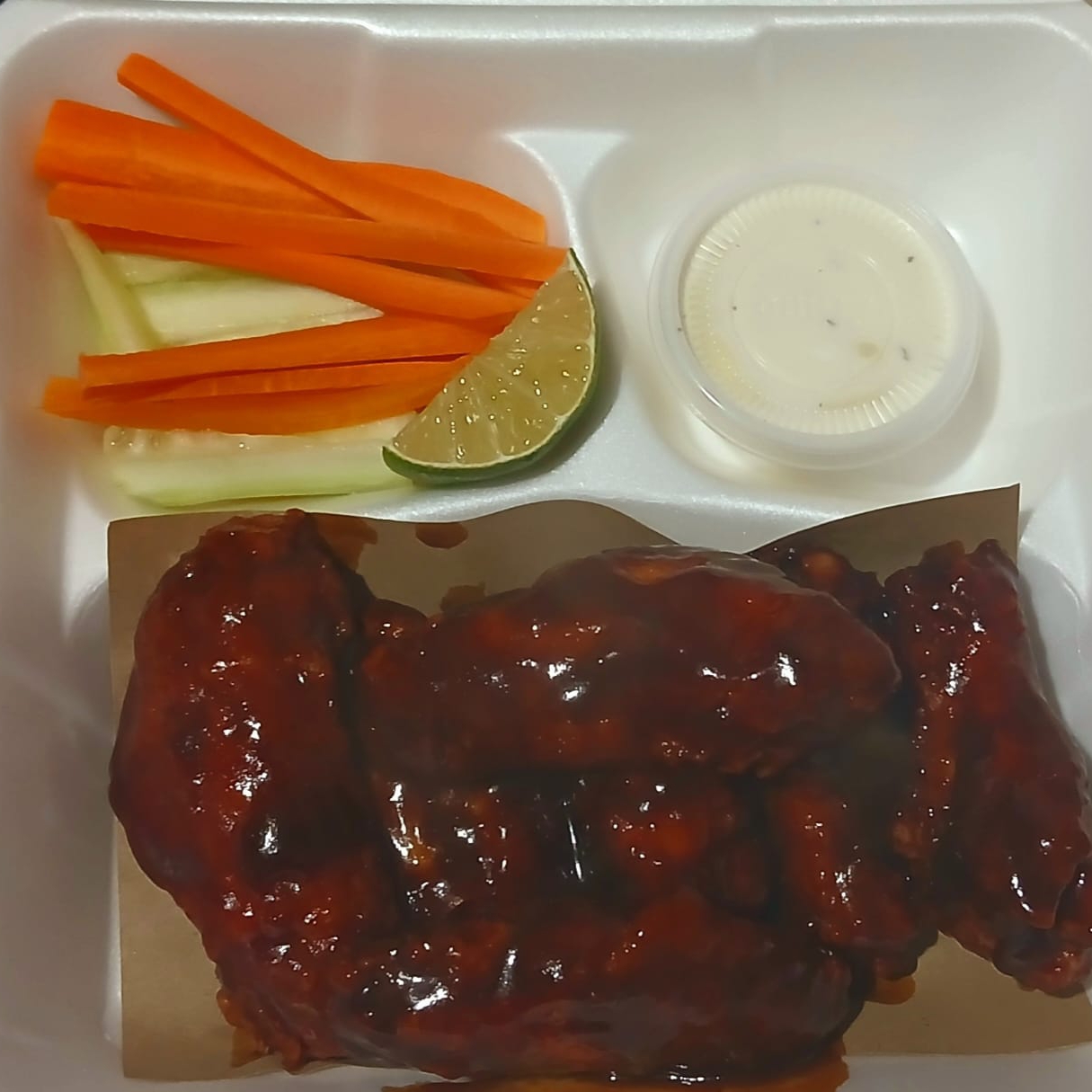 8 alitas grandes sabor tamarindohabanero 🤤😋 acompañadas de papas fritas zanahoria y pepino