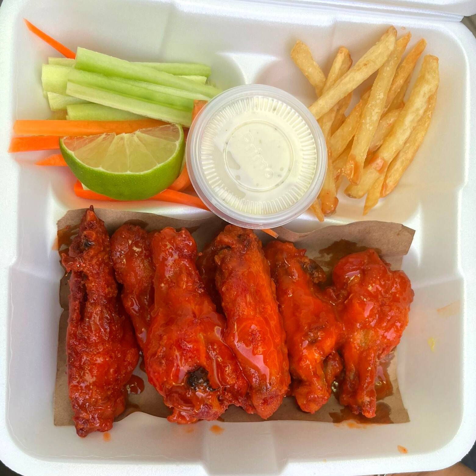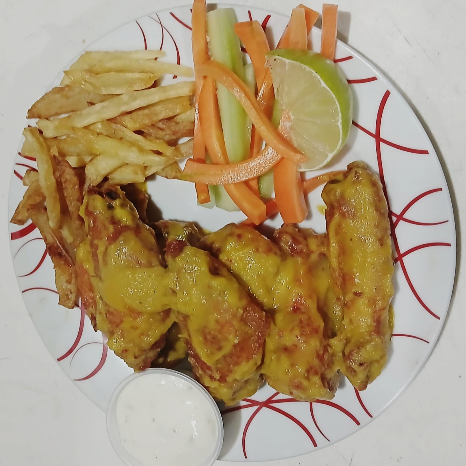 8 alitas grandes sabor b&b 🤤☺️😋 acompañadas de papas fritas zanahoria y pepino