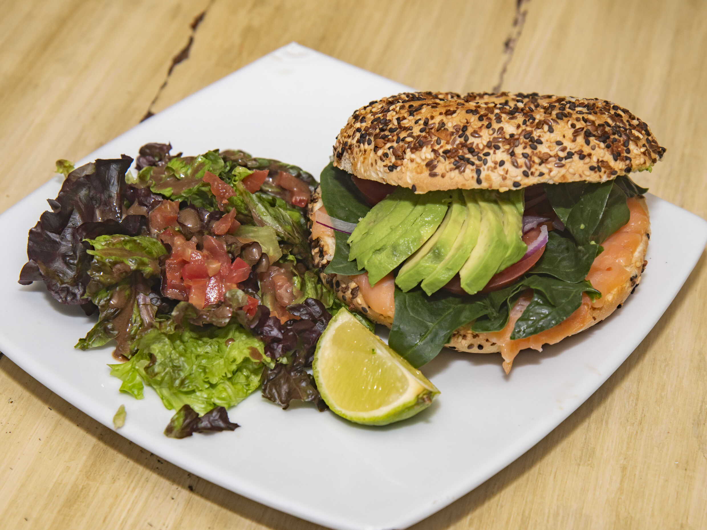 Pan bagel "everthing" casero, queso Boursin casero, salmón ahumado, aguacate, cebolla morada, jitomate, espinaca, queso crema con alcaparras. Acompañado de ensalada de lechuga.