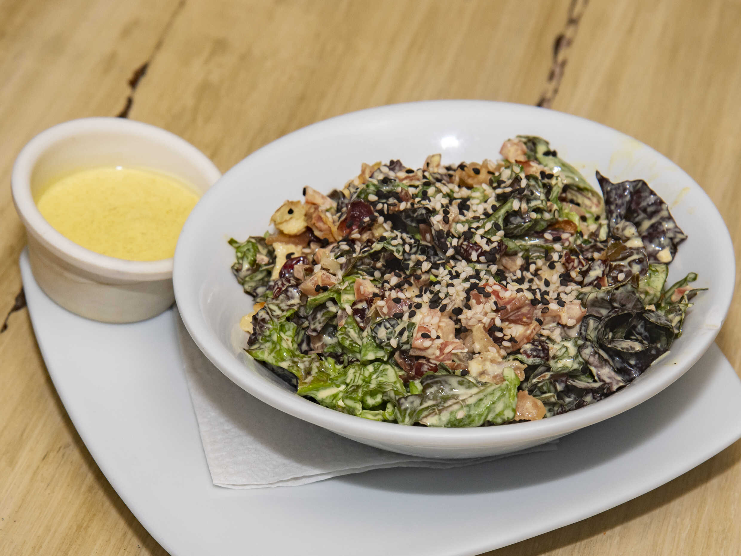 Lechuga sangría, pechuga de pollo asado, jitomate, tocino crujiente, ajonjolí, arandanos, todo mezclado.