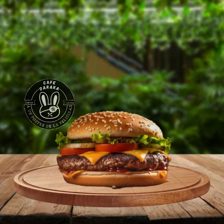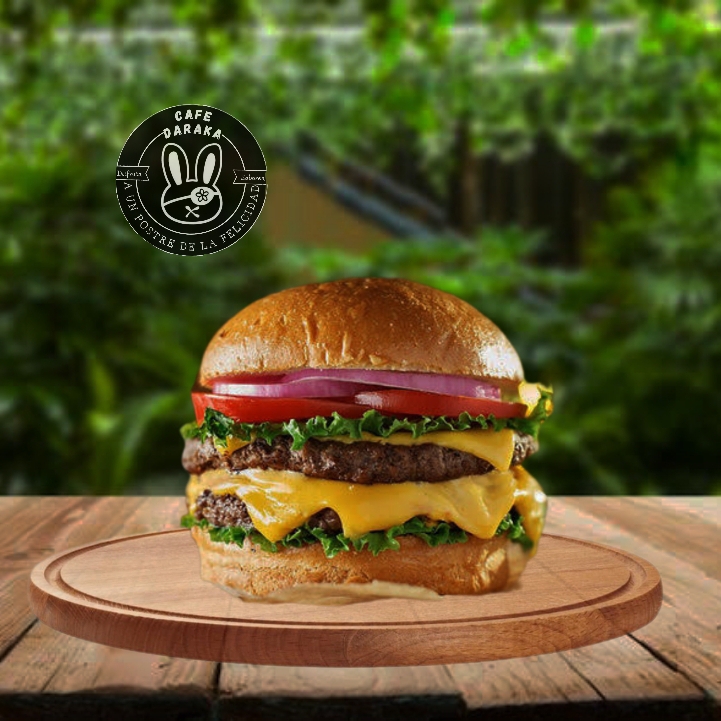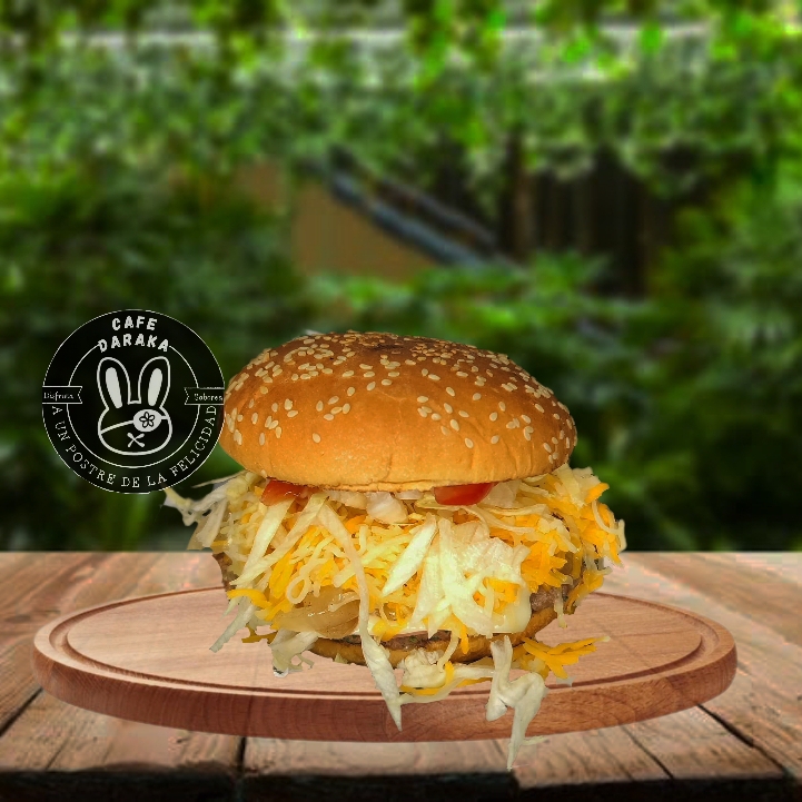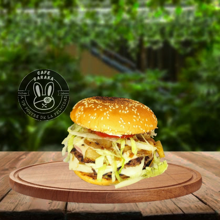 hamburguesa con doble carne 100% res (receta de la casa), queso, jamon, jitomate, lechuga, cebolla salteada