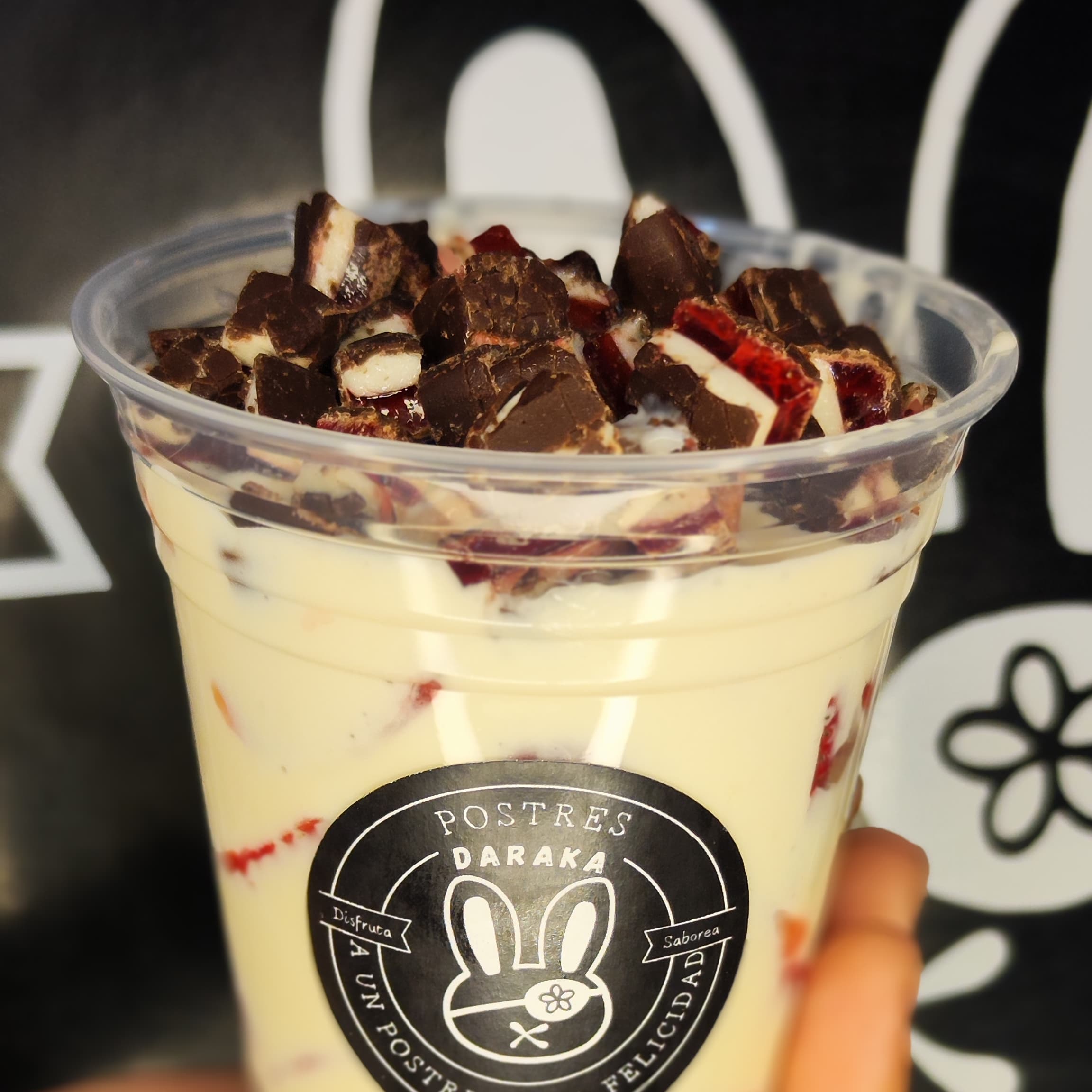 bebida fria preparada con gansito, mermelada de fresa, chocolate y se decora con crema batida y mermelada encima
