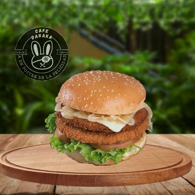 hamburguesa doble de pollo,ranch, queso, jamon, jitomate, lechuga, cebolla salteada