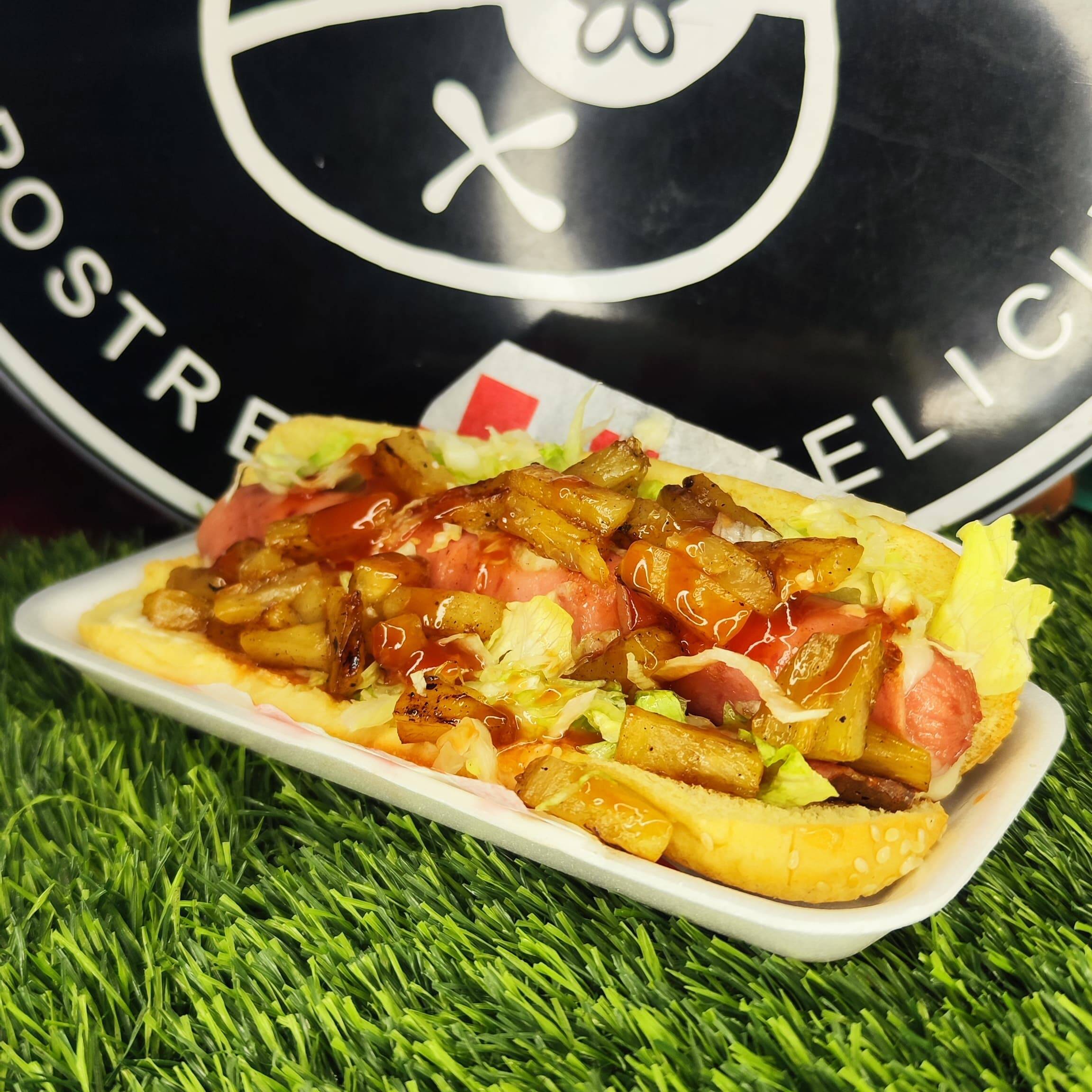 hot dog preparado con salchicha de pavo, piña salteada, queso, jamon, lechuga, tomate y cebolla salteada
