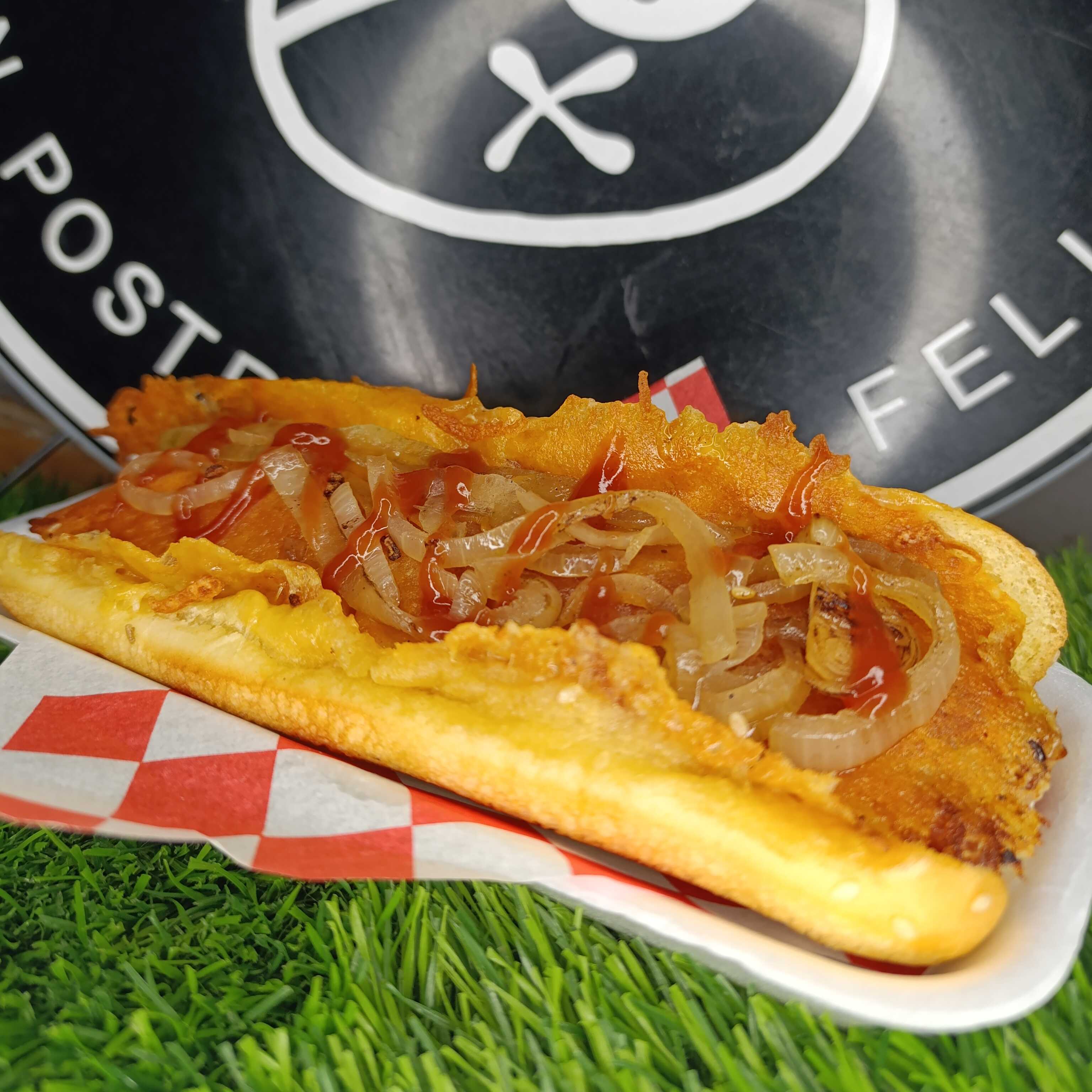 hot dog preparado con salchicha de pavo, mezcla de 4 quesos queso, jamon, lechuga, tomate y cebolla salteada