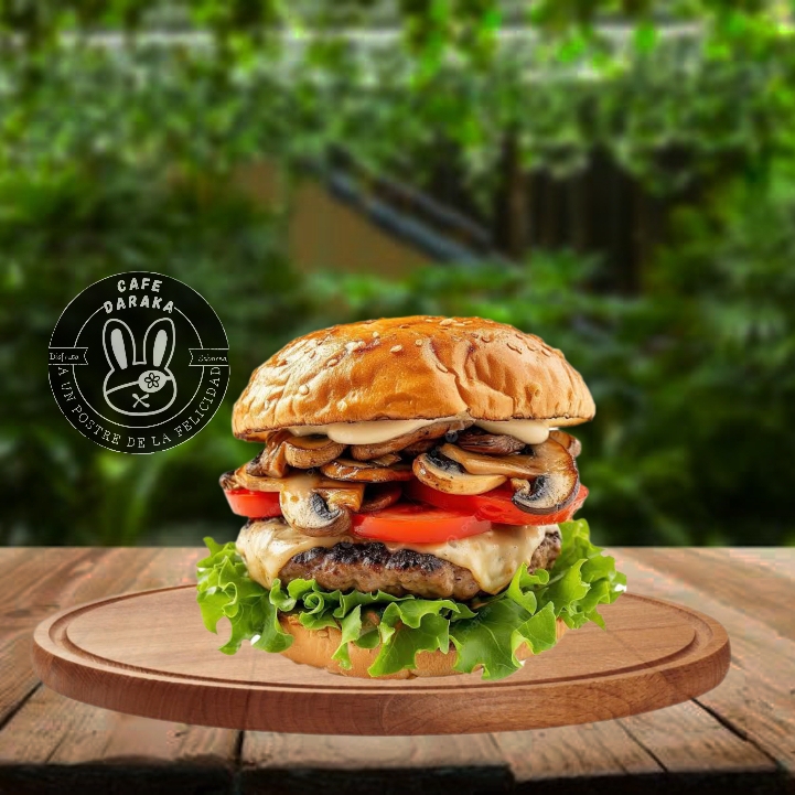hamburguesa con carne 100% res (receta de la casa), champiñones salteados, queso, jamon, jitomate, lechuga, cebolla salteada