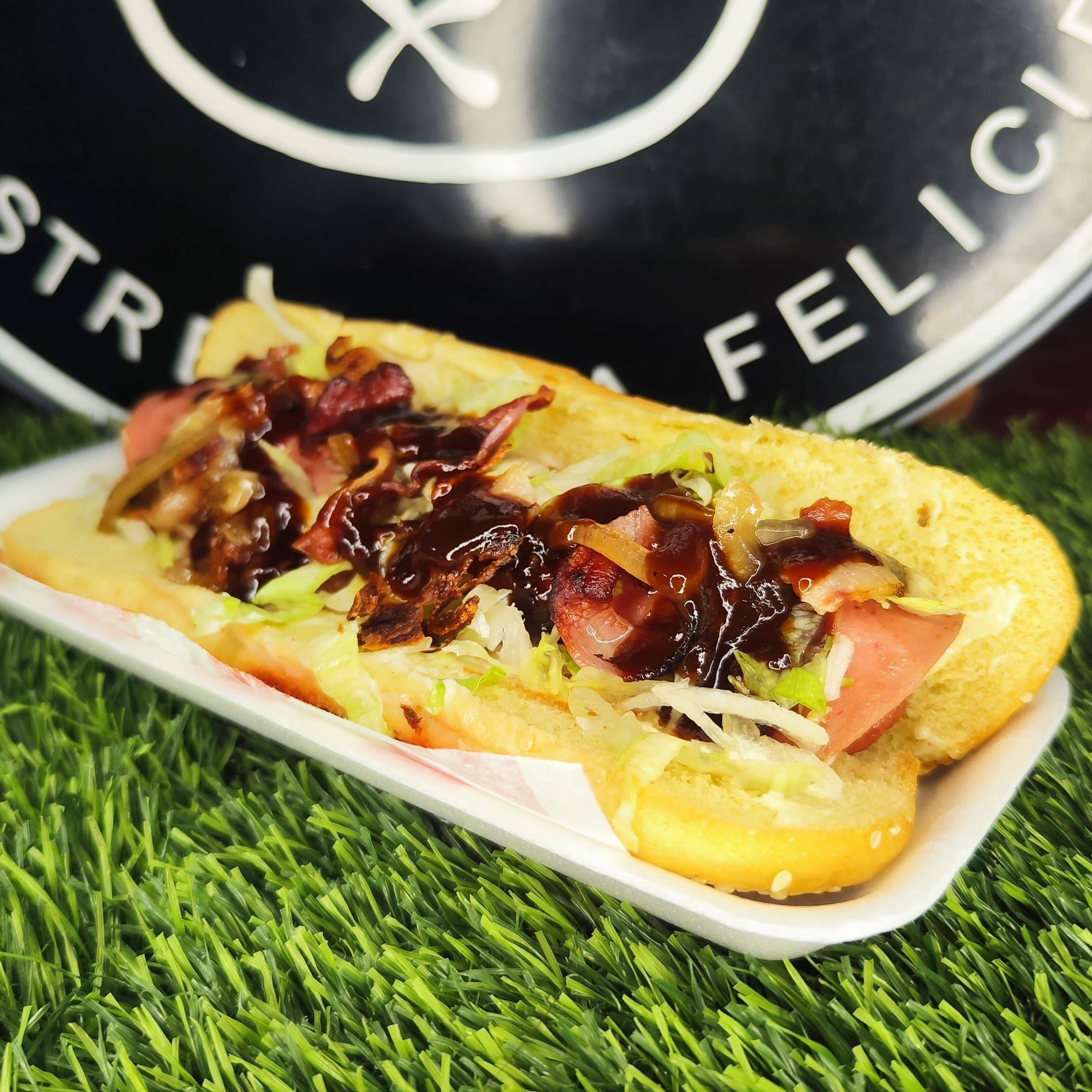 hot dog preparado con salchicha de pavo, tocino, salsa BBQ, queso, jamon, lechuga, tomate y cebolla salteada