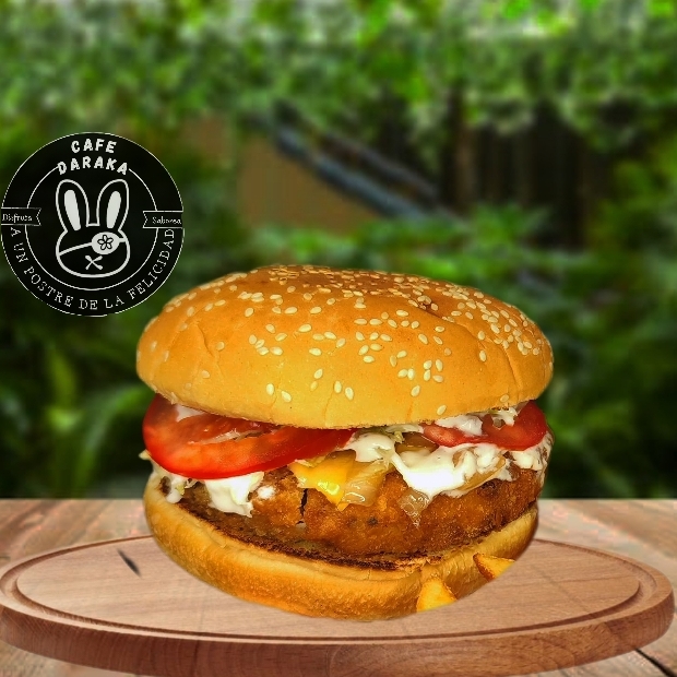 hamburguesa de pollo, salsa ranch, queso, jitomate, lechuga, cebolla salteada