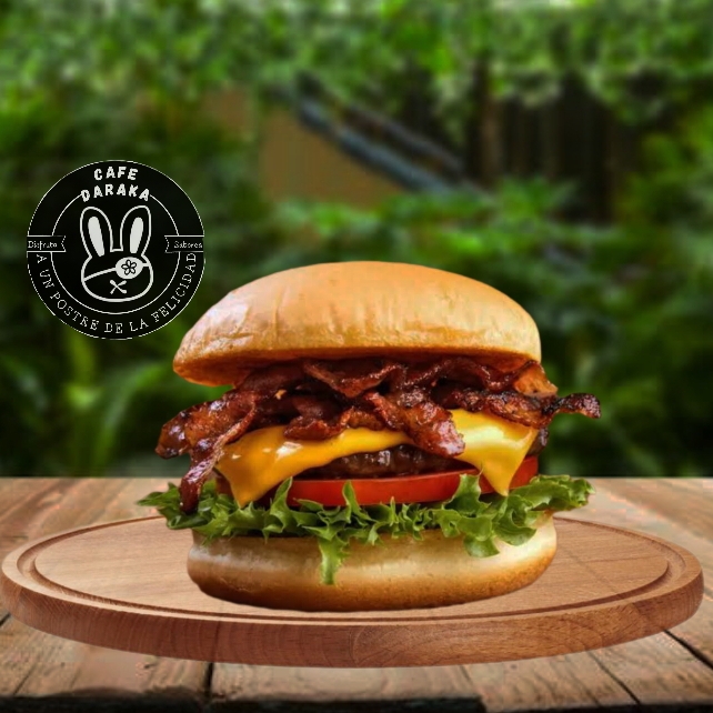 hamburguesa con carne 100% res (receta de la casa), tocino, salsa BBQ, queso, jamon, jitomate, lechuga, cebolla salteada
