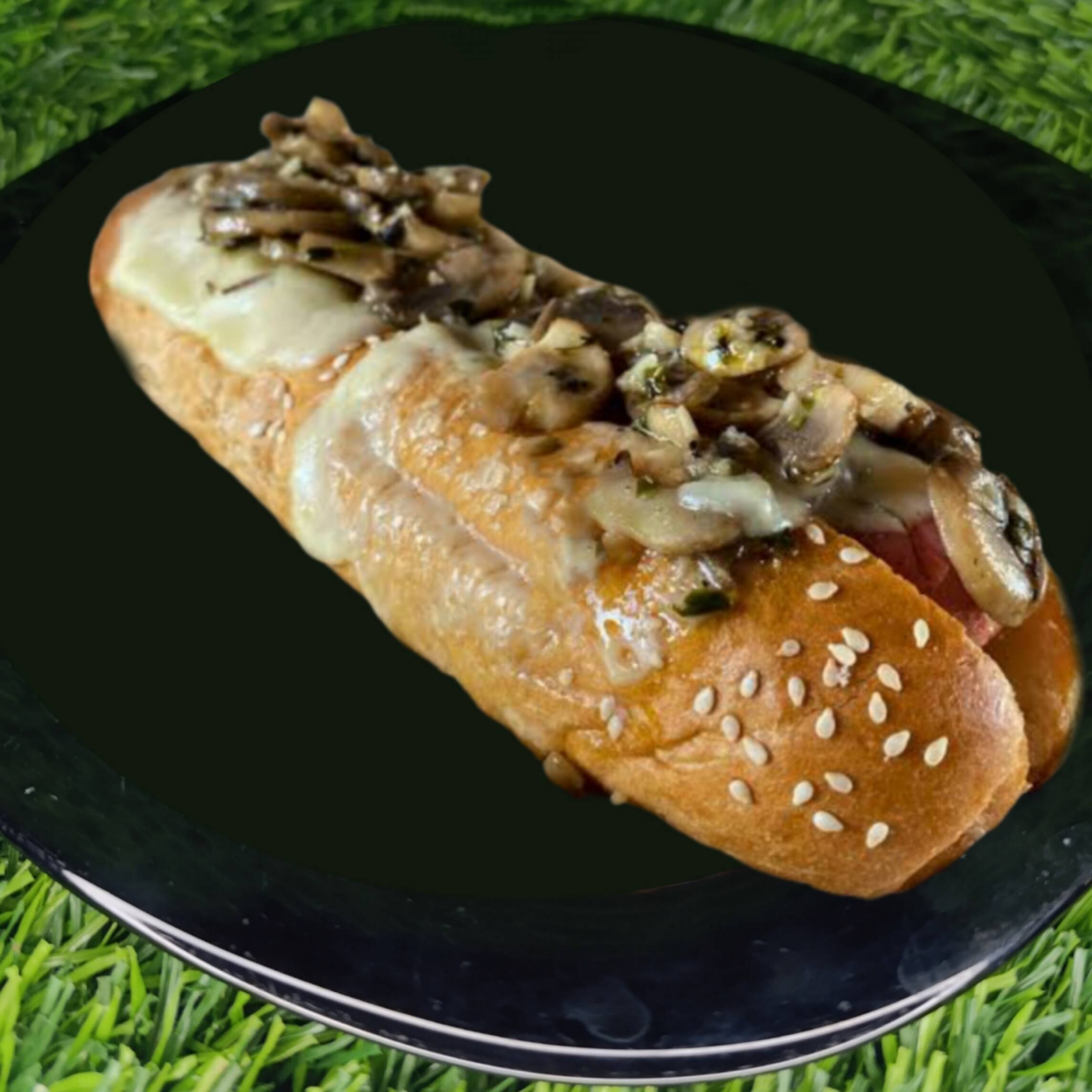 hot dog preparado con salchicha de pavo, champiñones salteados, queso, jamon, lechuga, tomate y cebolla salteada