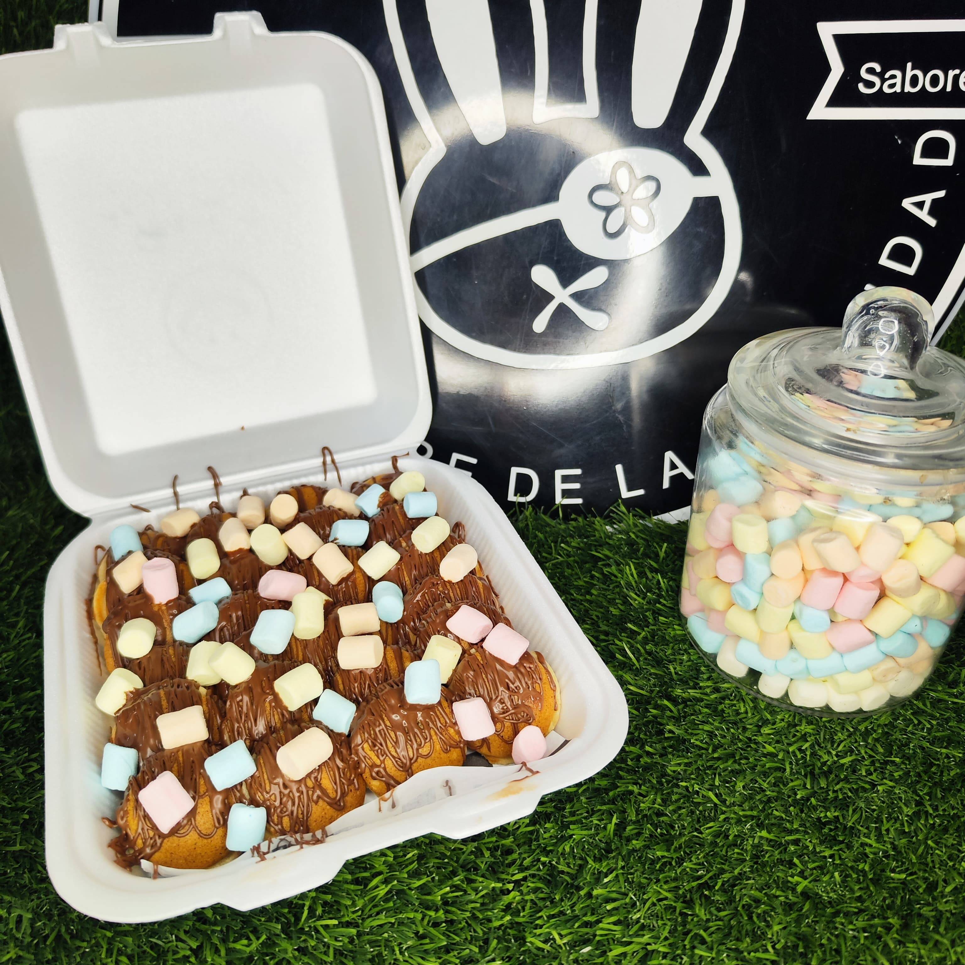 12 piezas de esponjosos mini hot-cakes con 1 toping y 1 untable a elegir.
