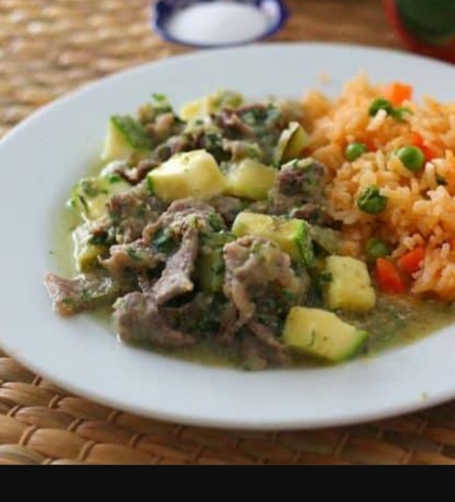Puntas de bistec de cerdo guisadas con papitas y zanahoria bañado en salsa verde acompañado de arroz y frijoles refritos, tortillas de maiz