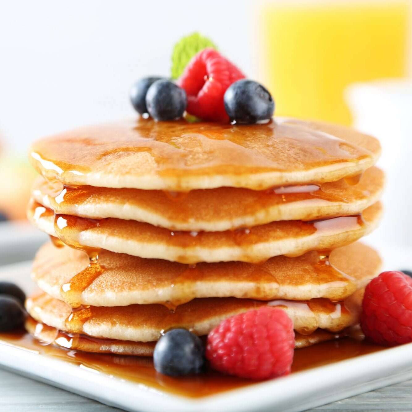 4 pz de hot cakes con platano y manzana, miel maple mermelada